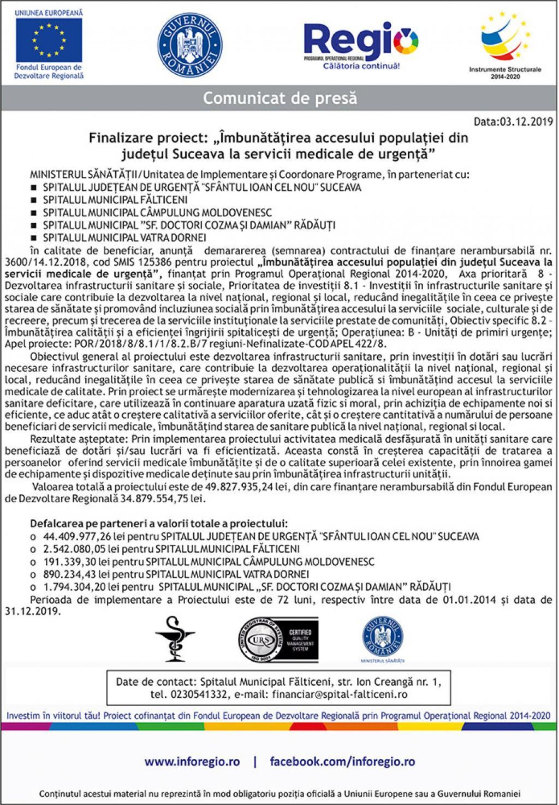 Date de contact: Spitalul Municipal Fălticeni, str. Ion Creangă nr. 1, tel. 0230541332, e-mail: financiar@spital-falticeni.ro