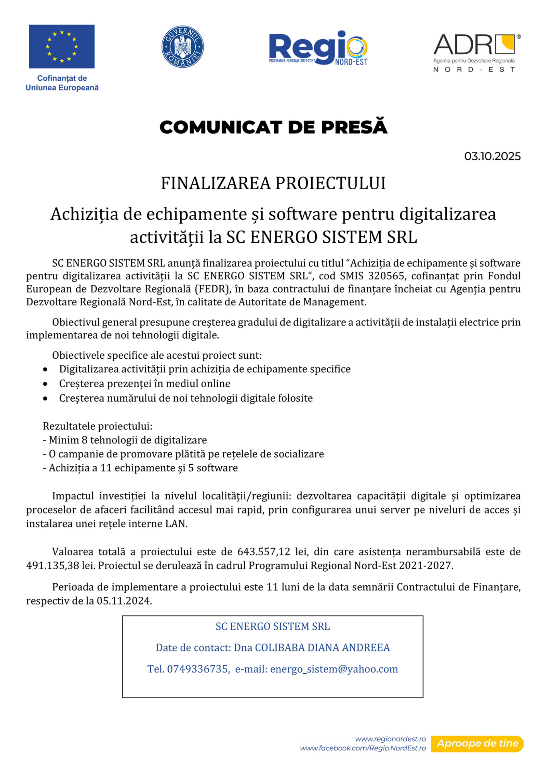 SC ENERGO SISTEM SRL anunță finalizarea proiectului cu titlul “Achiziția de echipamente și software pentru digitalizarea activității la SC ENERGO SISTEM SRL“, cod SMIS 320565, cofinanțat prin Fondul European de Dezvoltare Regională (FEDR), în baza contractului de finanțare încheiat cu Agenția pentru Dezvoltare Regională Nord-Est, în calitate de Autoritate de Management.