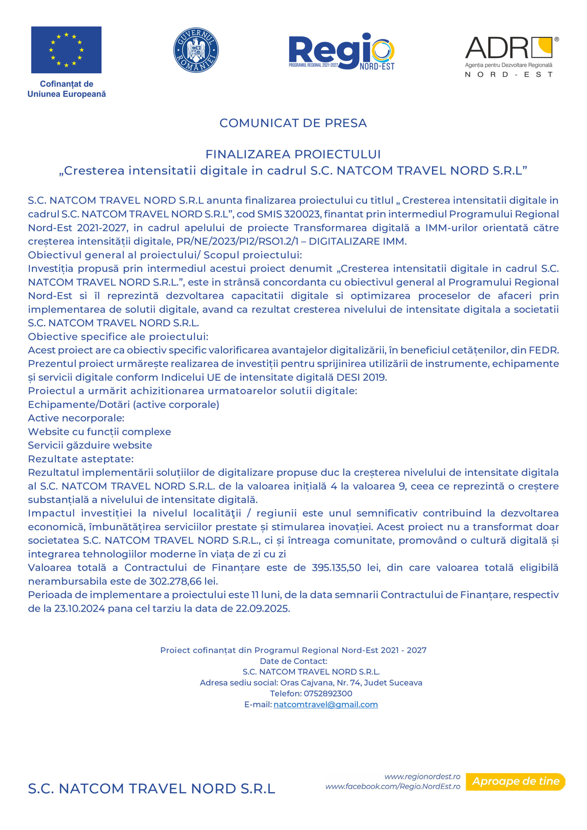 S.C. NATCOM TRAVEL NORD S.R.L anunta finalizarea proiectului cu titlul „ Cresterea intensitatii digitale in cadrul S.C. NATCOM TRAVEL NORD S.R.L”, cod SMIS 320023, finantat prin intermediul Programului Regional Nord-Est 2021-2027, in cadrul apelului de proiecte Transformarea digitală a IMM-urilor orientată către creșterea intensității digitale, PR/NE/2023/PI2/RSO1.2/1 – DIGITALIZARE IMM.