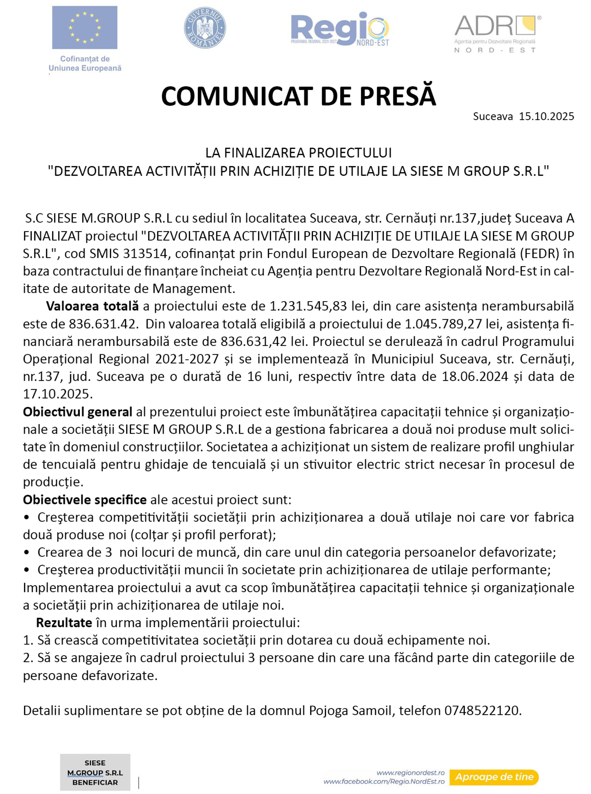 S.C SIESE M.GROUP S.R.L cu sediul în localitatea Suceava, str. Cernăuți nr.137,județ Suceava A FINALIZAT proiectul „DEZVOLTAREA ACTIVITĂȚII PRIN ACHIZIȚIE DE UTILAJE LA SIESE M GROUP S.R.L”, cod SMIS 313514, cofinanțat prin Fondul European de Dezvoltare Regională (FEDR) în baza contractului de finanțare încheiat cu Agenția pentru Dezvoltare Regională Nord-Est in calitate de autoritate de Management.