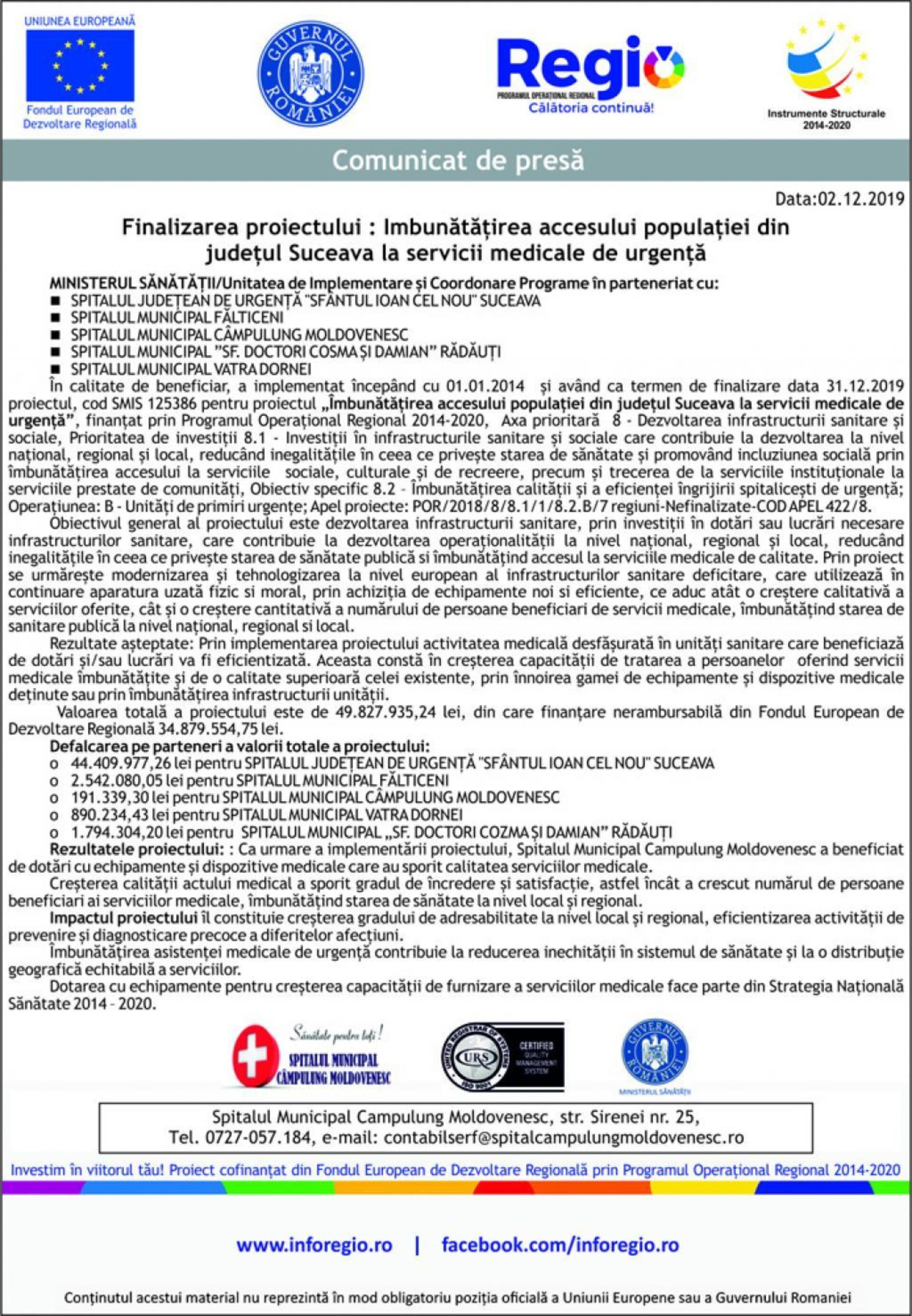 Spitalul Municipal Campulung Moldovenesc, str. Sirenei nr. 25, tel. 0727/057184, e-mail: contabilsef@spitalcampulungmoldovenesc.ro