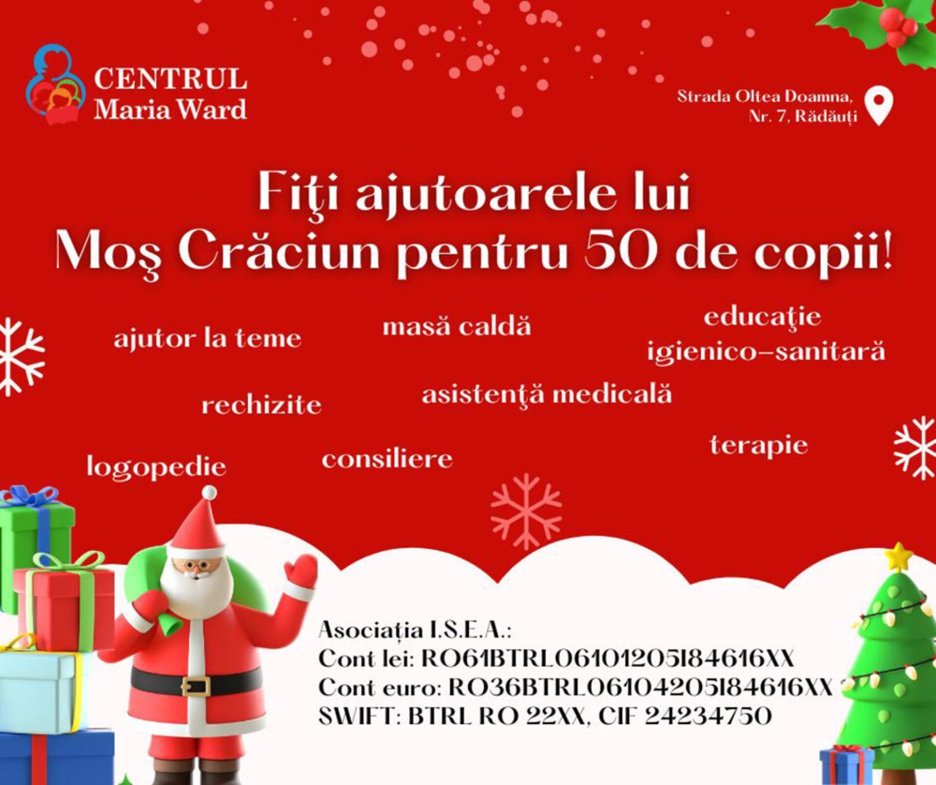 „Fiți ajutoarele lui Moș Crăciun pentru 50 de copii!” este o campanie umanitară lansată de Centrul social Maria Ward din Rădăuți. Aici există un centru de zi pentru copiii defavorizați cu risc de abandon școlar și familial. Ei provin din familii cu situație materială precară și s-ar bucura ca oamenii de bine să le facă o bucurie și să le trimită un dar, acum, în prag de sărbători.