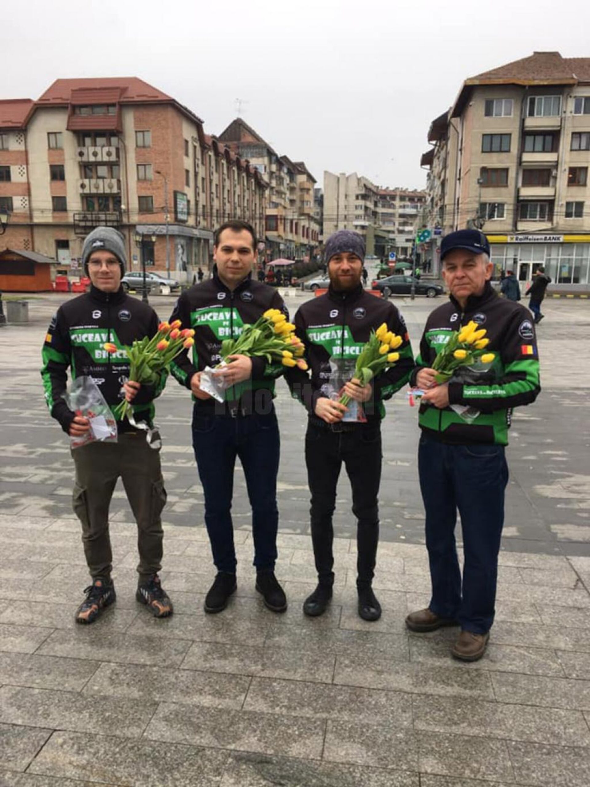 Duminică, în mai multe zone ale municipiului, membrii Asociației Sportive Suceava pe Bicicletă au împărțit flori și au felicitat sucevencele cu ocazia Zilei Internaționale a Femeii.