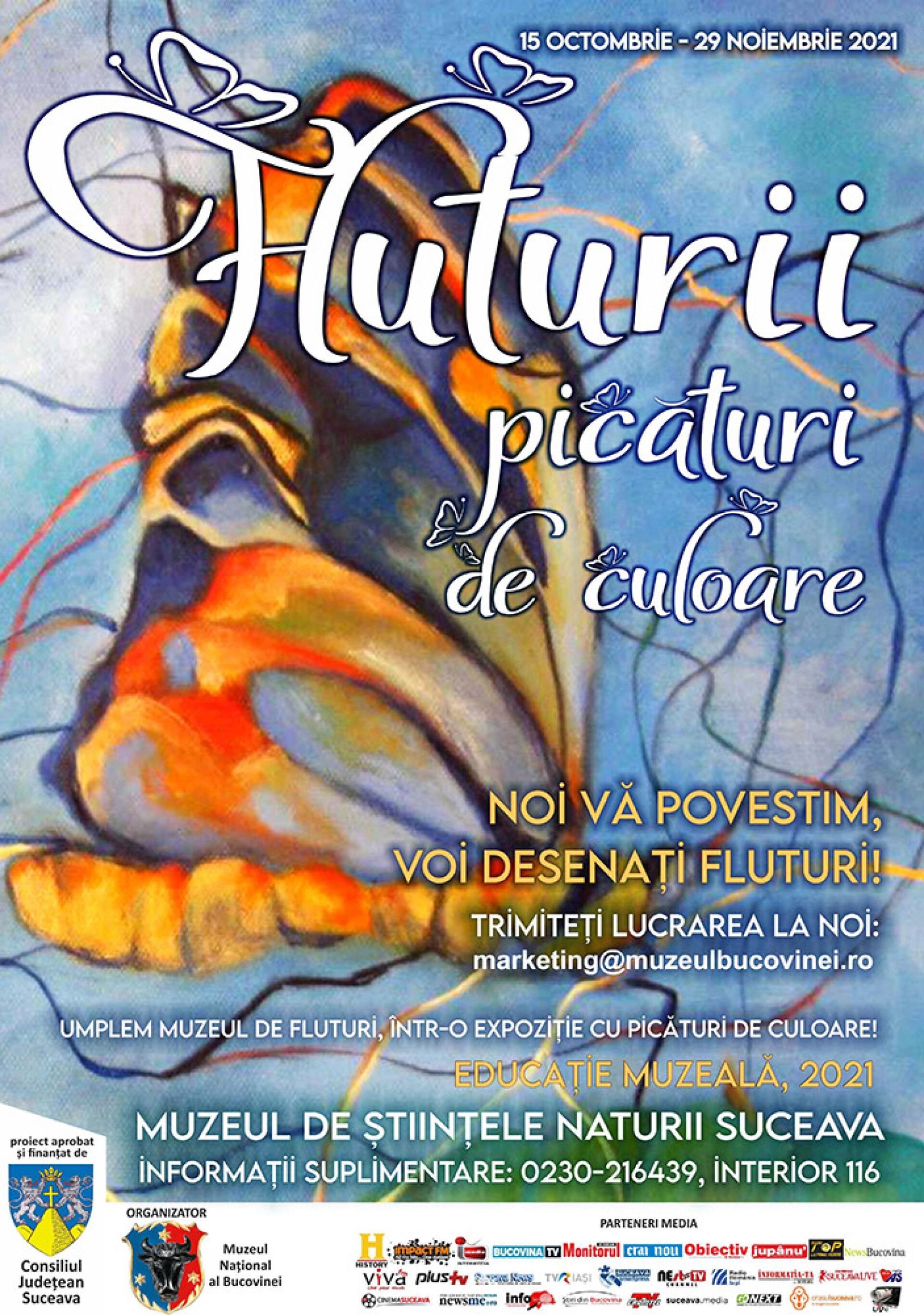 „Fluturii – picături de culoare” este o nouă temă de educație muzeală din oferta culturală a Muzeului Național al Bucovinei, începând cu 15 octombrie 2021, adresată preșcolarilor și elevilor. Poveștile celor mai fascinante și frumos colorate specii de lepidoptere conservate, păstrate cu mare grijă în Depozitul de Entomologie al Muzeului de Științele Naturii din Suceava, sunt aduse în fața publicului de către specialiștii Biroului Științele Naturii și cei ai Biroului Educație, Marketing și Comunicare.