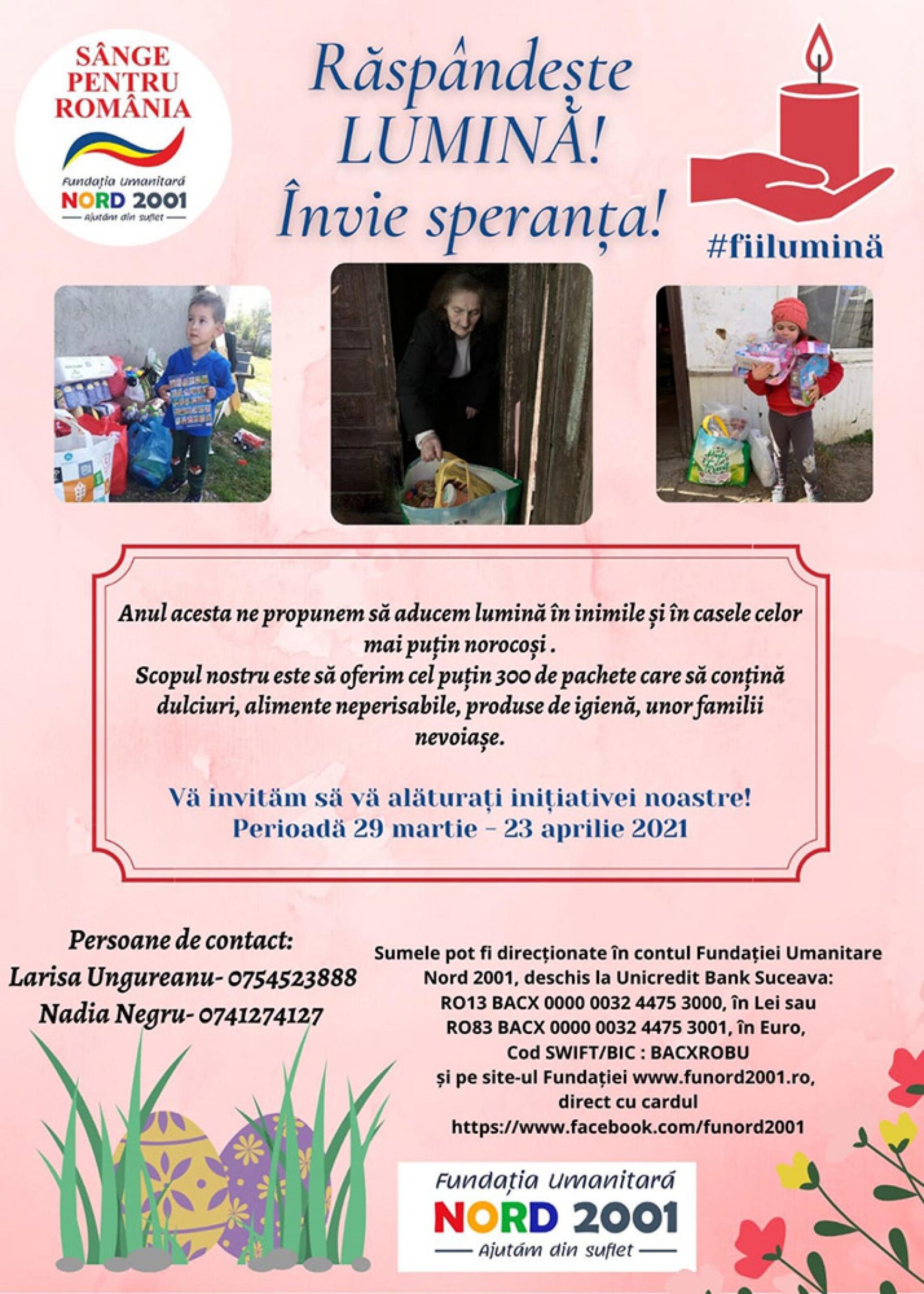 „Dorim să aducem lumină în inimile și casele celor aflați în dificultate. Flacăra speranței poate licări și pentru ei, cu ajutorul tău, cu ajutorul nostru. E timpul iertării, e timpul pentru milostenie, e timpul să ajutăm încă o dată, din puținul nostru, al fiecăruia. Alții nu au nimic. Noi putem să schimbăm ceva, putem să le oferim o speranță, o bucurie, putem să fim lumină”, este mesajul inițiatorilor campaniei umanitare. Persoane de contact: Larisa Ungureanu (telefon: 0754 523 888) și Nadia Negru (telefon: 0741 274 127).