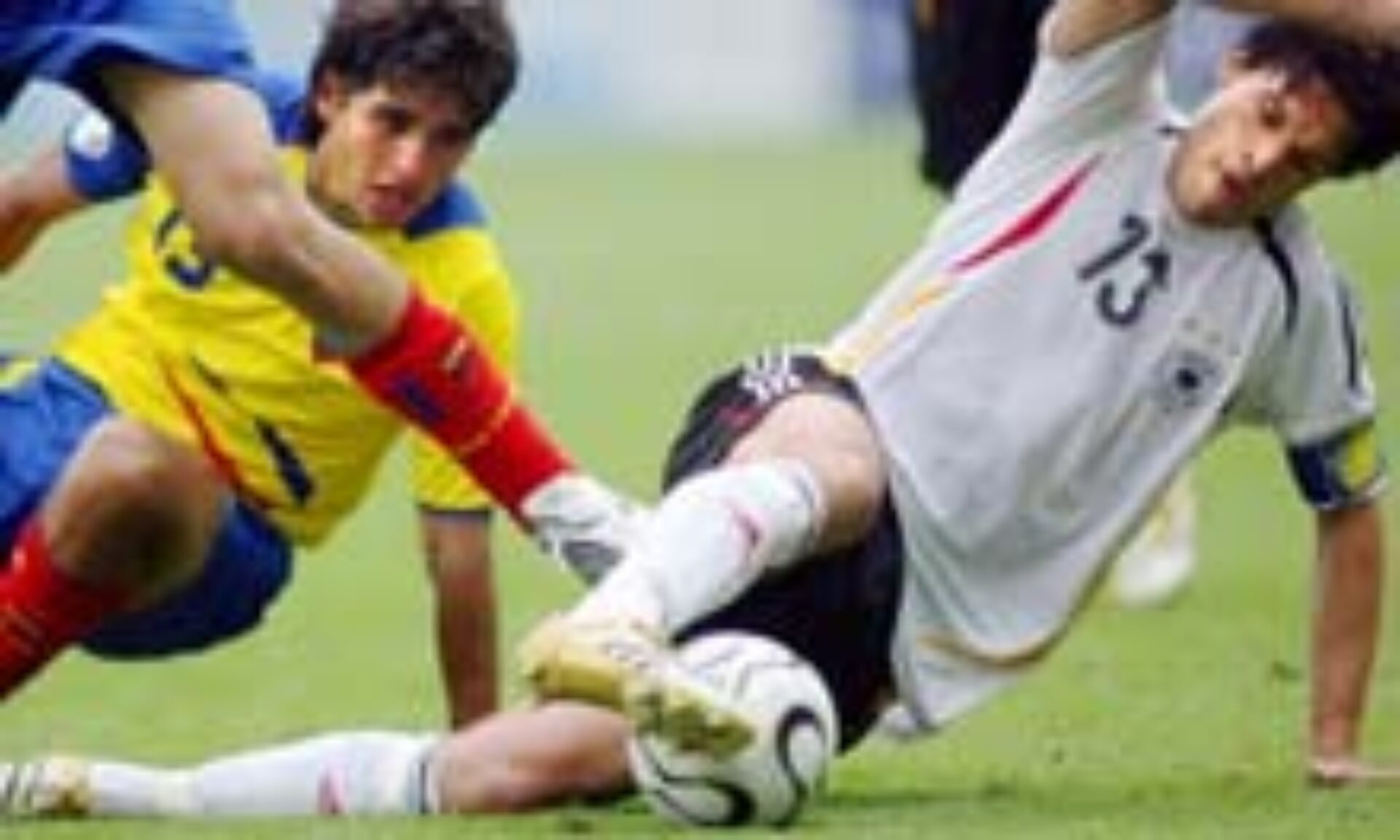 Echipa națională a Germaniei a trecut la pas de reprezentativa Ecuadorului, cu scorul de 3-0 (2-0), în meciul care a stabilit ordinea echipelor calificate din grupa A. Deși trebuia să arate ca o adevărată finală a grupei, partida de la Berlin a scos în evidență o echipă ecuadoriană plictisită, departe de ce a arătat în întâlnirile cu Polonia și Costa Rica, și pe atacantul german Miroslav Klose hotărât să lupte pentru titlul de golgheter al competiției. Meciul a început alert, ecuadorienii, care și-au menajat trei titulari, având o ocazie de a marca imediat după fluierul de început. Germanii au replicat imediat și Klose a deschis scorul, în minutul 4, după o prelungită acțiune de atac: Mertesacker a centrat de pe stânga, Schweinsteiger a recentrat la Klose, iar acesta din urmă a înscris cu un șut la colțul lung din interiorul careului. Surprinzător, imediat după deschiderea scorului partida s-a liniștit. Ecuadorienii au plimbat mingea fără să pună în pericol poarta lui Lehmann, în timp ce gazdele s-au mulțumit să pândească greșelile din defensiva adversă. La una dintre acestea, în minutul 44, Ballack a săltat o minge peste apărarea ecuadoriană, iar Klose a marcat după ce a profitat de indecizia fundașului Espinoza și a portarului Mora, atacantul echipei Werder Bremen instalându-se în fruntea clasamentului golgheterilor cu patru reușite. Apatia ecuadorienilor ar putea fi ilustrată de câteva cifre statistice: primul corner în minutul 50 și primul cartonaș galben al meciului în minutul 52, primit de Valencia. Repriza a doua a adus ceva mai multă incisivitate în rândul oaspeților. Două șuturi de la distanță trimise de Edwin Tenorio și Mendez l-au obligat pe Lehmann să respingă în corner, însă golul a venit tot în poarta lui Mora, în minutul 57. Un contraatac de manual, din trei pase, pornit după o recuperare în marginea propriului careu reușită de Huth, s-a finalizat cu o centrare perfectă a lui Schneider și o reluare imparabilă a lui Podolski. La 3-0, Klinsmann a făcut repede toate schimbările pentru a-și odihni câteva dintre piesele grele, Klose, Frings și Schneider, iar meciul a intrat în categoria celor amicale. Germania a încheiat, astfel, grupa A pe primul loc, cu trei victorii din tot atâtea meciuri și așteaptă rezultatele din grupa B, cea în care evoluează Anglia și Suedia, pentru a-și afla adversara din optimile de finală. Ecuadorul a sărbătorit încă de la al doilea meci din grupă calificarea în optimi, cea mai bună performanță reușită vreodată la Cupa Mondială. Echipa sud-americană va întâlni în această fază a competiției formația de pe primul loc din grupa B, iar Germania va avea ca adversară echipa de pe locul doi.