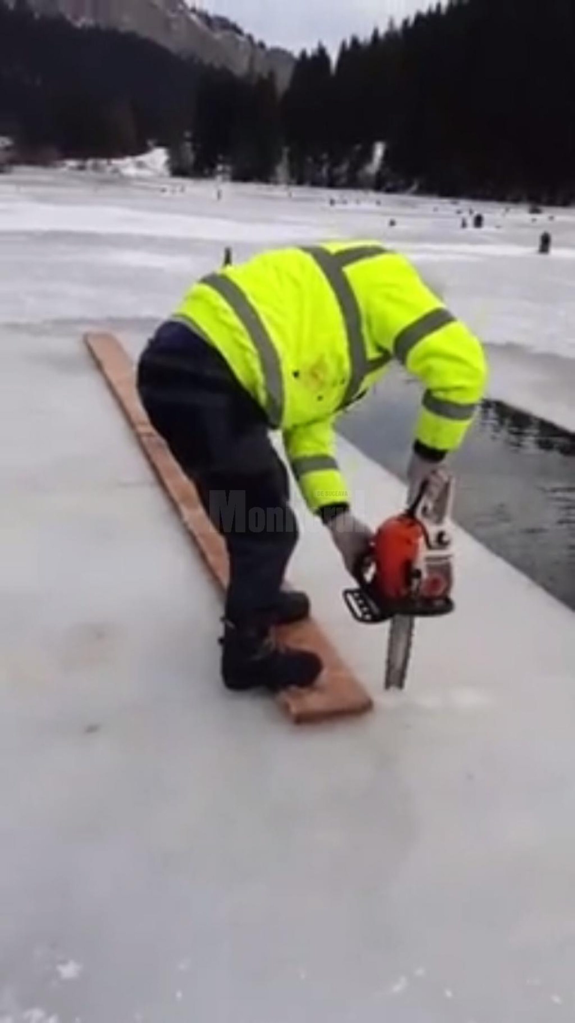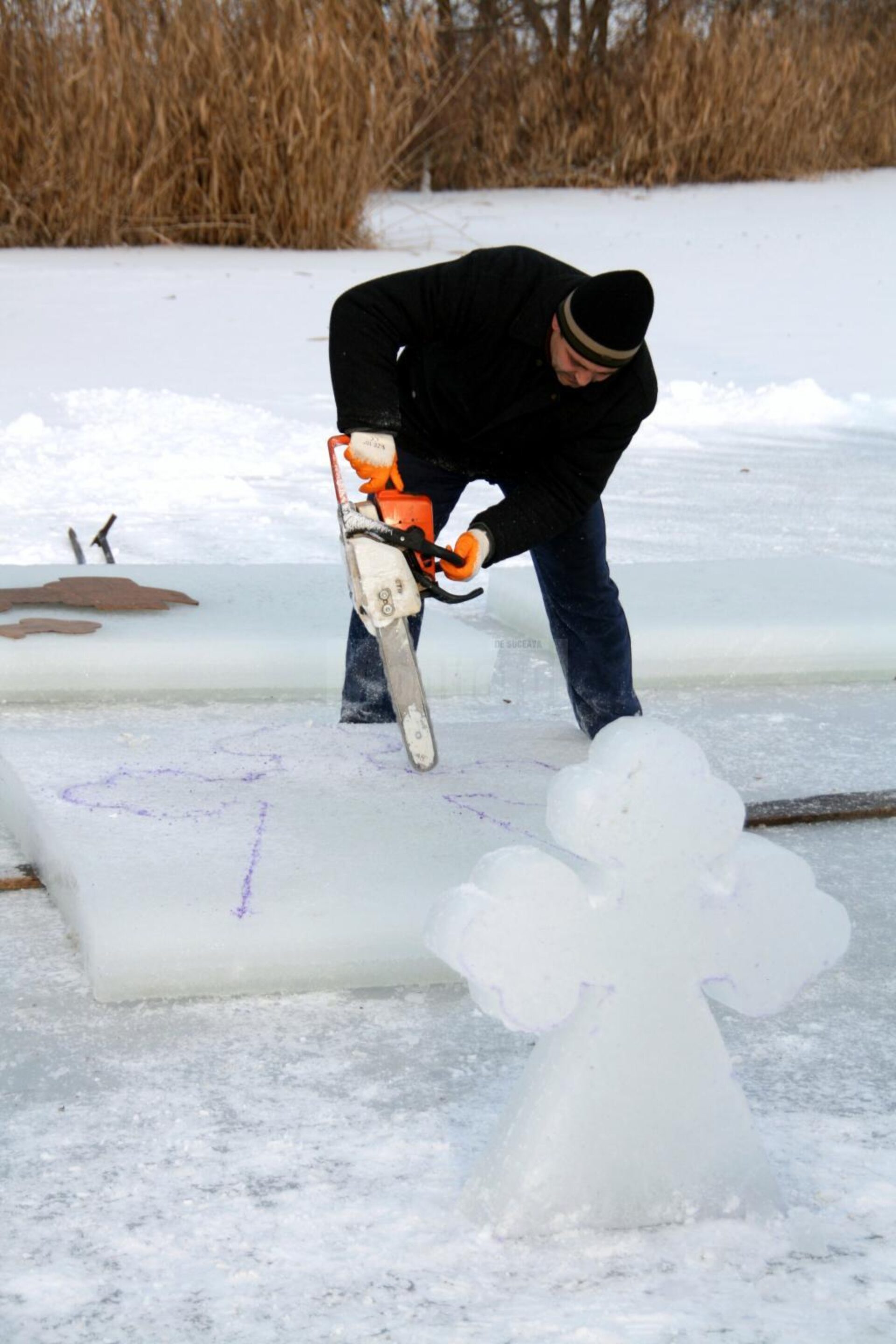 Odată ajunși la Lacu Roșu, vineri dimineață, pompierii au decupat cu drujba blocuri de gheață, pe care, cu atenție, le vor transporta la Bosanci. Cel mai probabil, sâmbătă după-amiază vor decupa din aceste blocuri de gheață crucile, „înarmați” tot cu drujba, nu cu ferăstrăul, ca pe vremuri, crucile fiind decupate după forma unui șablon. Pompierii vor mai folosi pentru confecționarea primei cruci de gheață pentru comună, din anul 2020, un liniar din lemn, șabloanele pentru cruci, confecționate din carton, dar cu o formă specială, pe care o folosesc doar bosâncenii, un creion chimic pentru a da contur crucii după șablon și mult entuziasm.