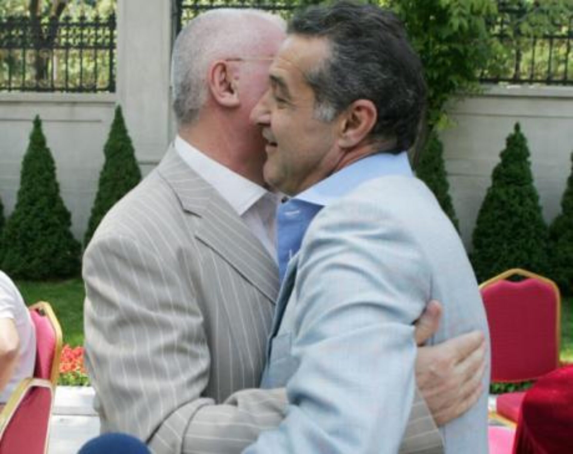 Mitică Dragomir s-a pupat cu Gigi Becali Apoi, la petrecere a venit și președintele LPF, Dumitru Dragomir. „Uite, ești în albumul familiei Steaua, cel mai tare președinte”, i-a spus Becali, arătându-i un album cu performanțele Stelei, cu imagini ale victoriei. „Ar trebui să fiu băgat în albumul fotbalului românesc pe viață”, i-a răspuns Dragomir, care i-a transmis că nu stă mult. „Stai jos, că altfel trec de partea lui Lupescu”, l-a amenințat Gigi Becali de câteva ori. „Ia treci, să vedem. Gura bate fundul. Vorbește frumos cu un deputat”, a glumit conducătorul LPF, care a plecat după câteva minute, înconjurat de ziariști, fără ca Becali să-și dea seama: „Hai cu toții, să mă ușchesc și eu, eu vreau să mănânc cu nevastă-mea”.