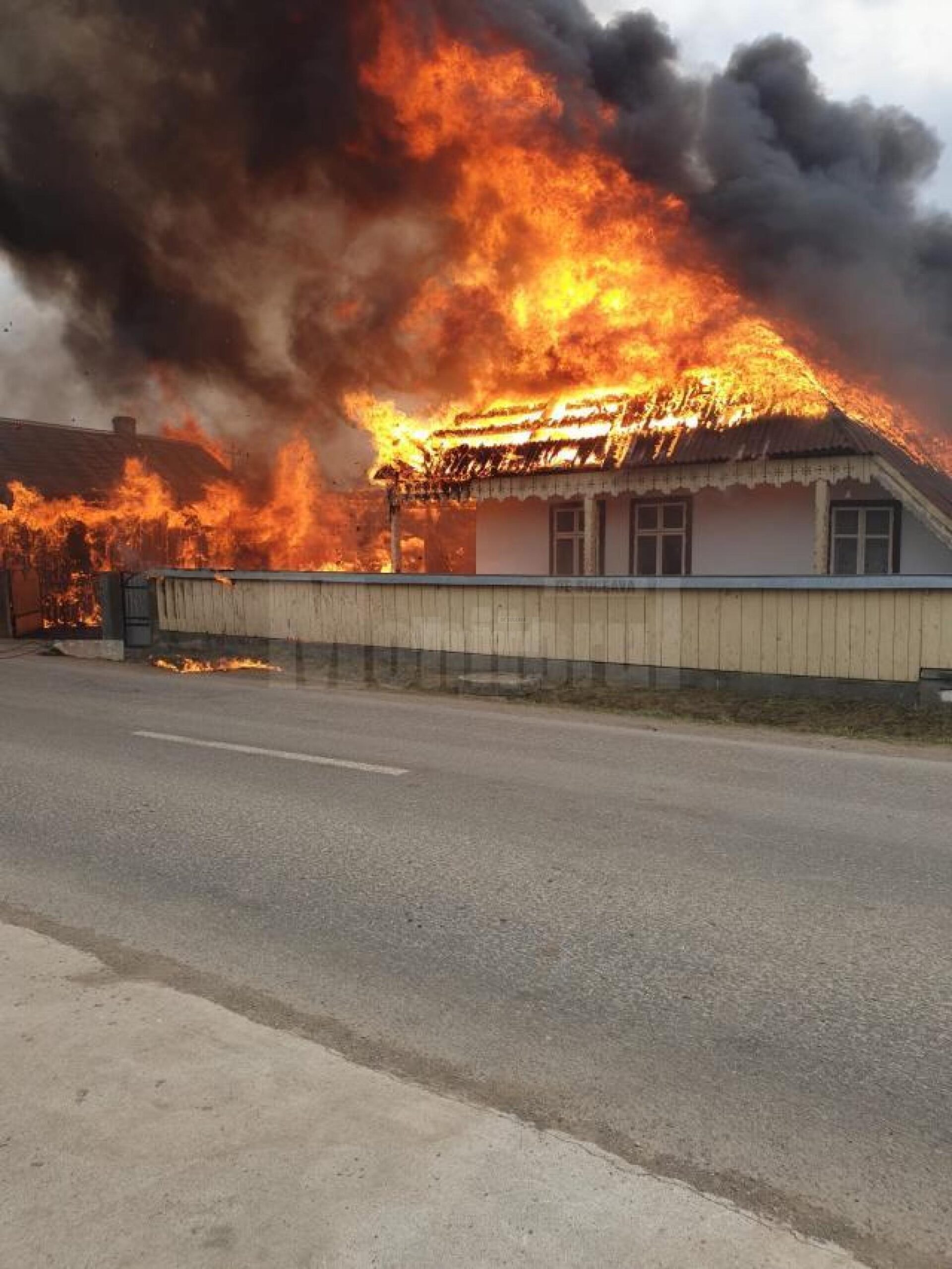 La sosirea echipajelor ardeau casa și anexele gospodărești, cu pericol de propagare la locuințele învecinate.