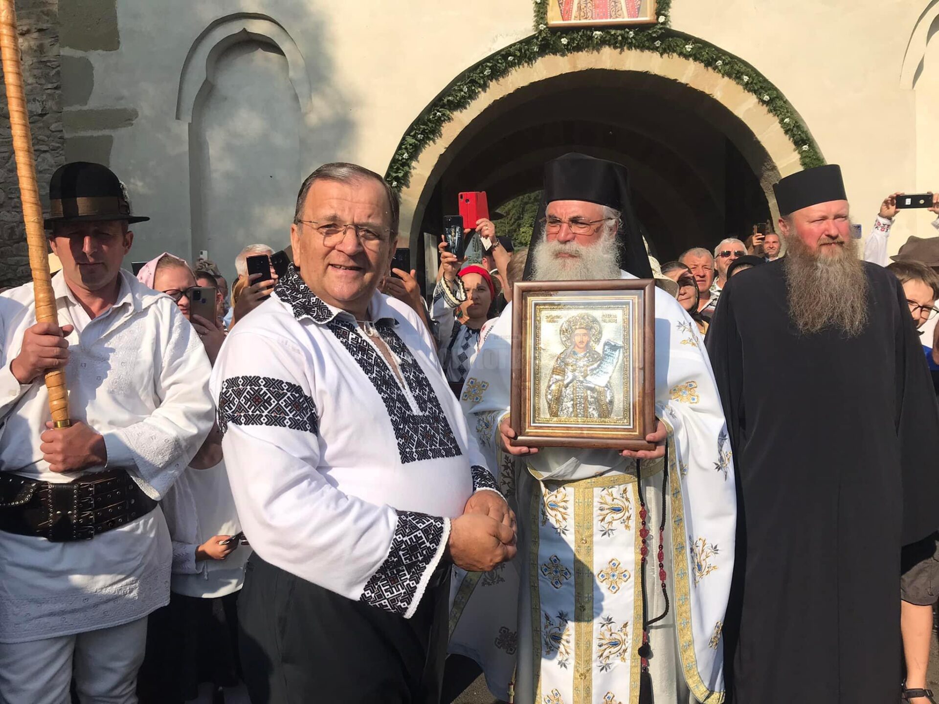Ajunși la poarta Mănăstirii Putna, pelerinii au fost întâmpinați în sunete de buciume de starețul Velnic Melchisedec, care avea în brațe icoana lui Ștefan cel Mare și Sfânt. Starețul mănăstirii i-a urat bun venit lui Gheorghe Flutur și celorlalți pelerini, amintind că astăzi se împlinesc 518 ani de la moartea marelui voievod dar și 30 de ani de la canonizarea lui Ștefan cel Mare. „Sunt 518 ani dar și 30 de ani de când Ștefan a fost așezat în icoană și în altar. Și ne bucurăm că ați venit astăzi la această măreață sărbătoare. Vă invităm împreună cu toții gospodarei Bucovinei. Dar nu sunt toți, sunt o parte. O parte de aici din partea românească. Mai avem și dincolo gospodari buni pe care îi așteptăm să vină”, a spus starețul Velnic Melchisedec. La rândul său, președintele Gheorghe Flutur, a spus că și cealaltă parte este „tot românească”.
