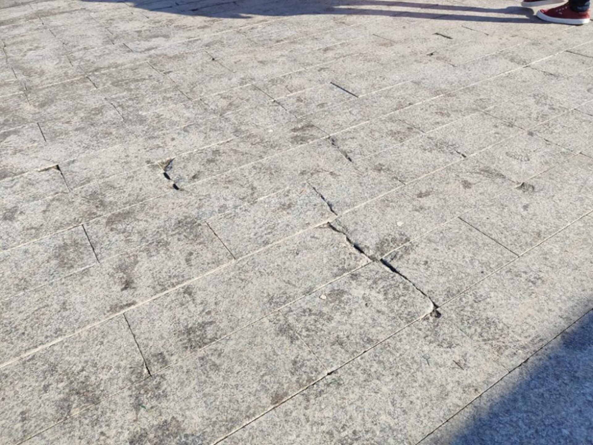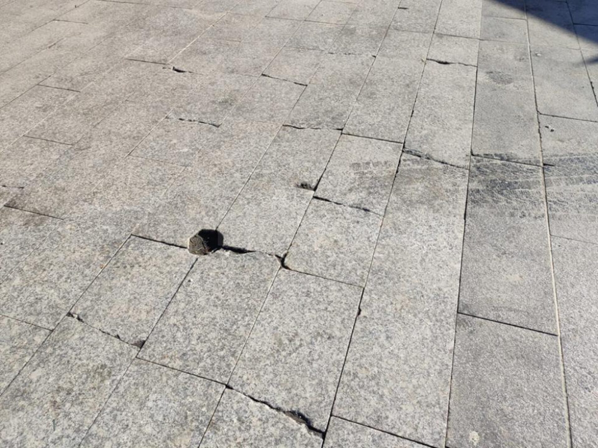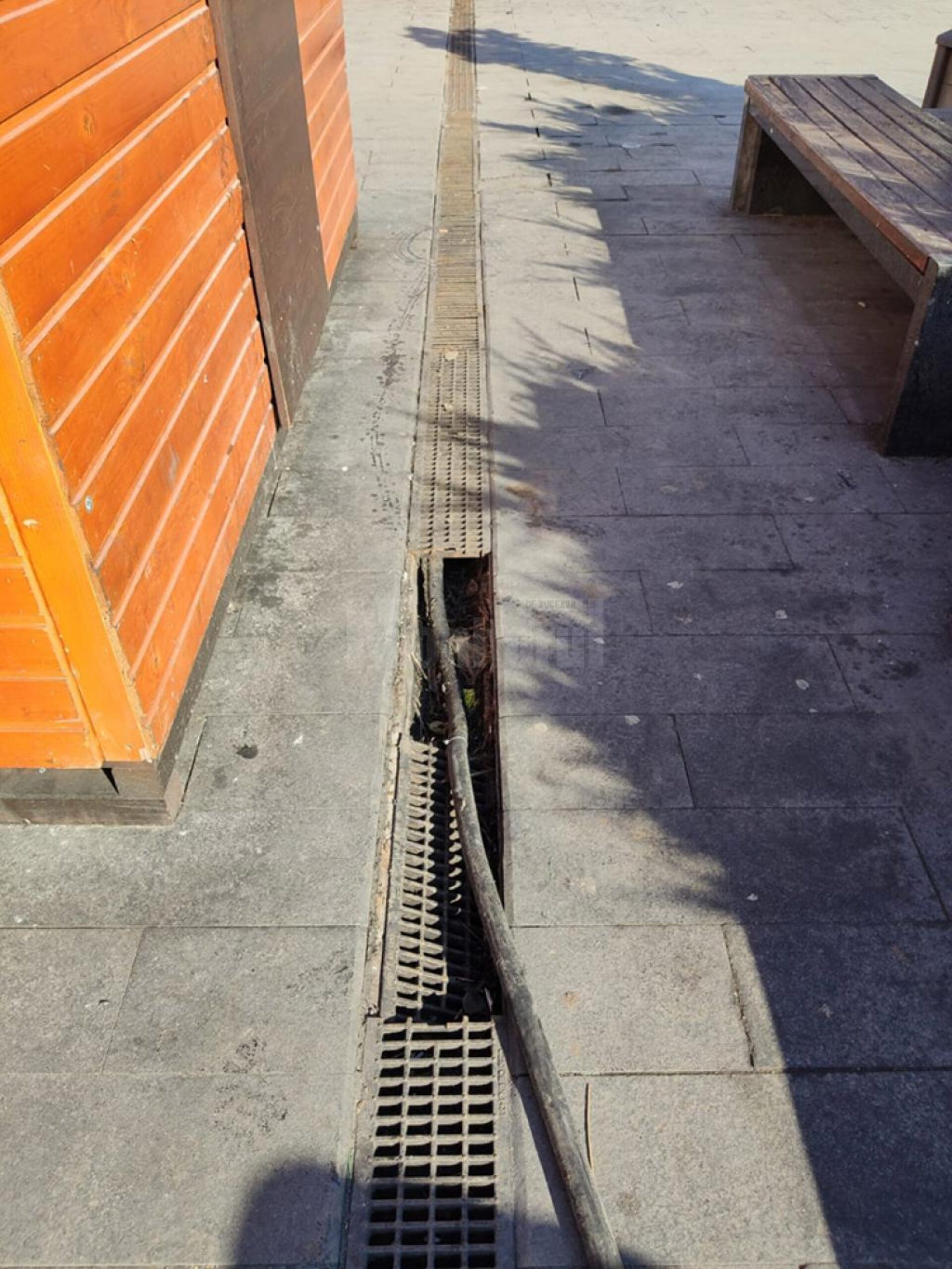 Aceleași dâre slinoase brăzdează coșurile de gunoi mozaicate, neprotejate nici măcar o singură dată prin utilizarea sacilor menajeri. Atmosfera este completată de păienjenișul crăpăturilor din dalele de granit chinezesc, lăbărțat în perimetrul în care, la diversele evenimente organizate în centru, au fost tarabe la care s-a pregătit mâncare.