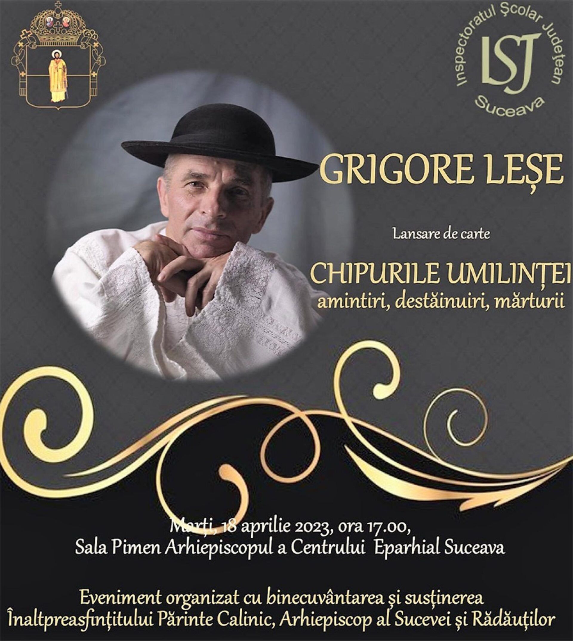 Evenimentul cultural-educațional se va desfășura marți, 18 aprilie 2023, începând cu ora 17:00, în Sala „Pimen Arhiepiscopul” a Centrului Eparhial Suceava, și îl are ca invitat pe profesorul, producătorul, scriitorul și interpretul Grigore Leșe.