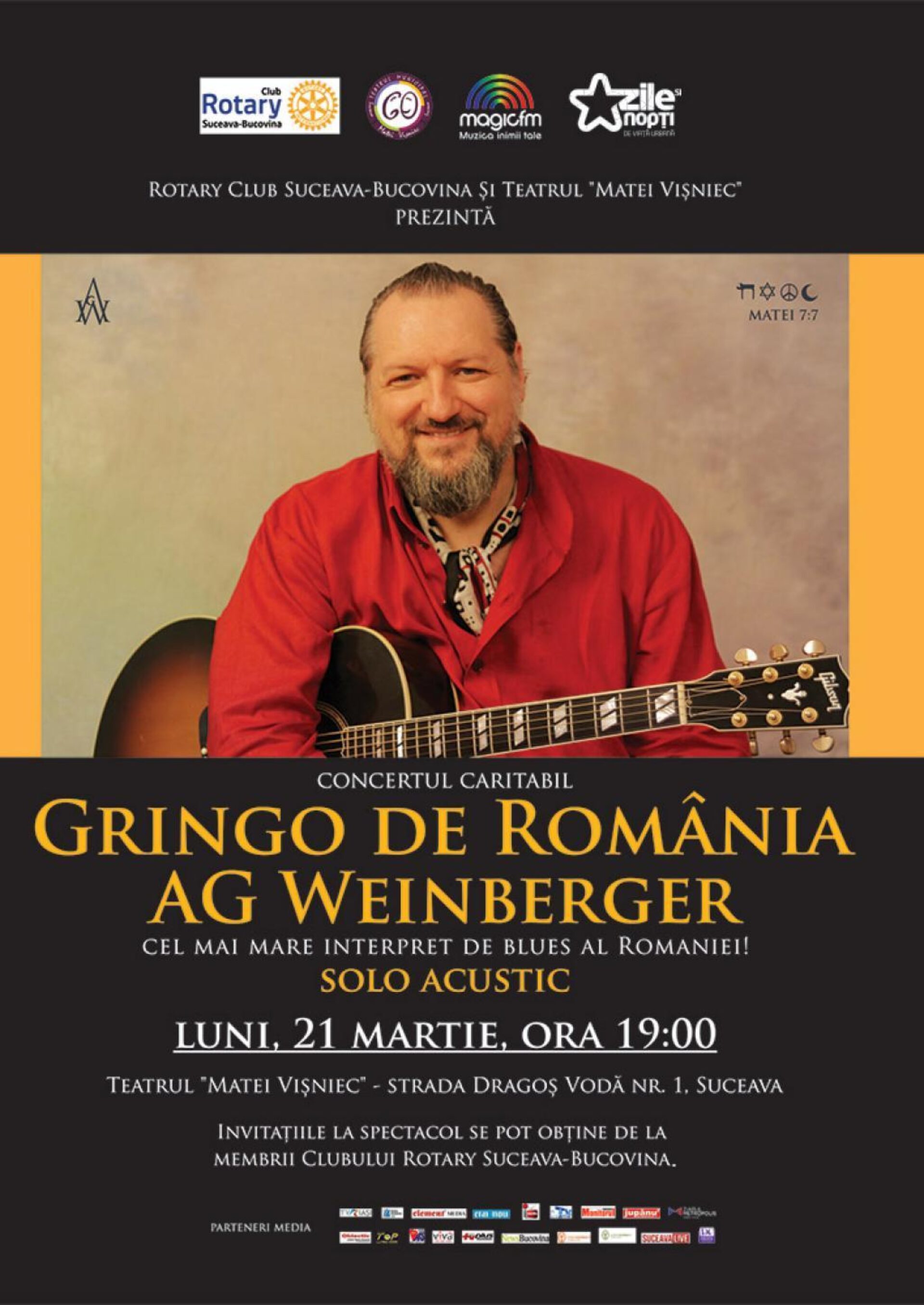 Rotary Club Suceava Bucovina, în parteneriat cu Teatrul Municipal „Matei Vișniec” Suceava, organizează luni, 21 martie, de la ora 19.00, evenimentul caritabil cu genericul „Gringo de România”, un solo acustic susținut de A.G. Weinberger, cel mai bun interpret de blues pe care l-a dat România.