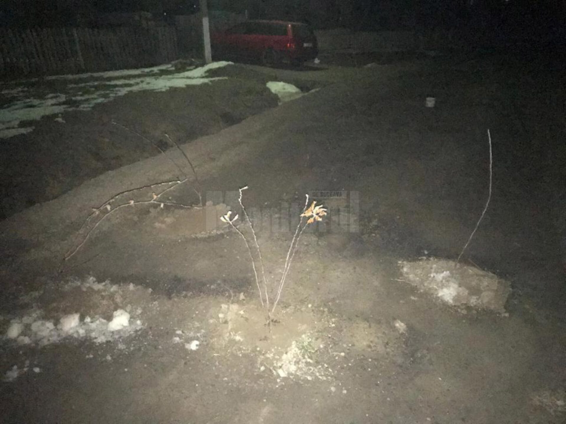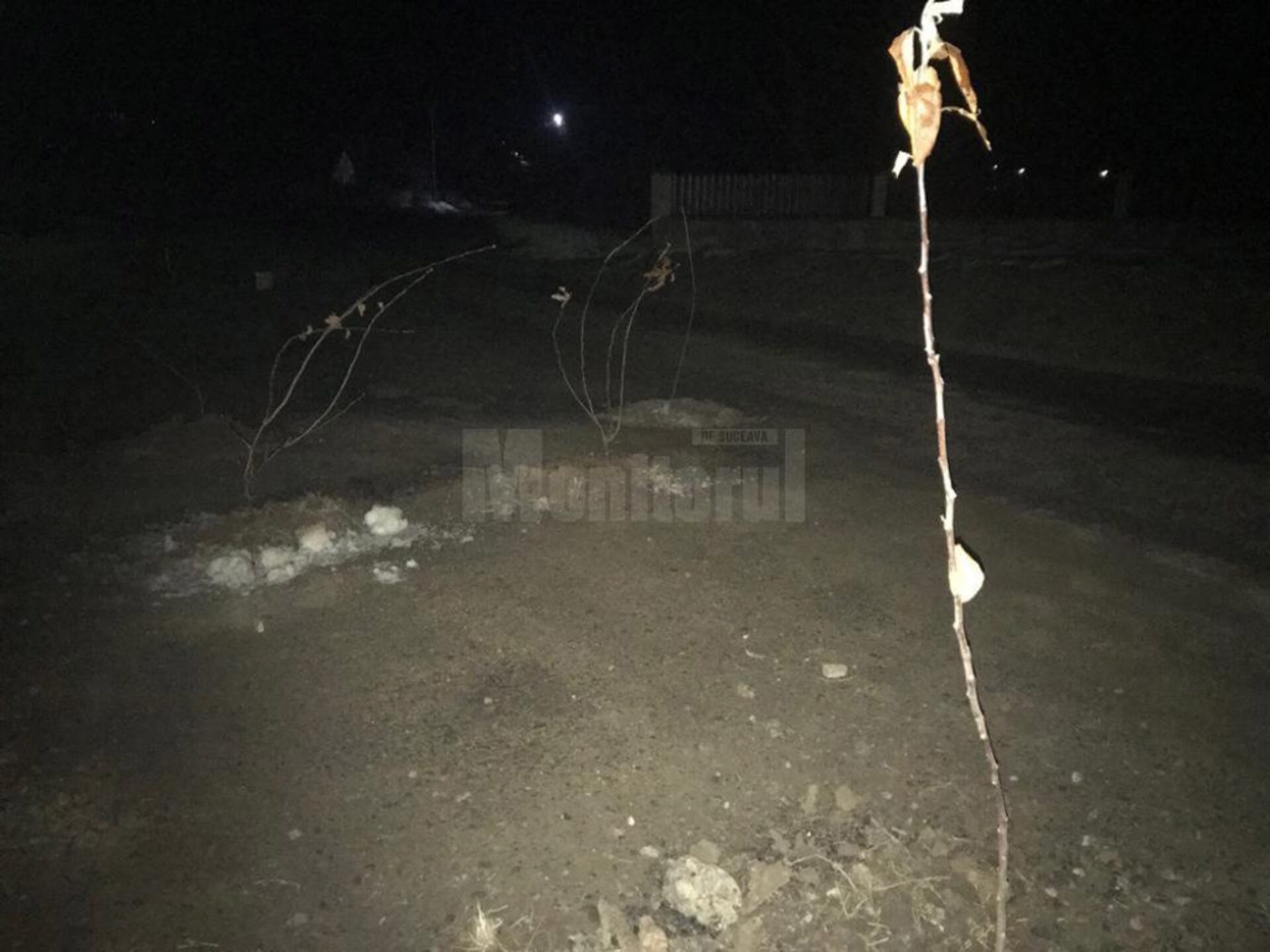 Din imagini se observă și faptul că iluminatul public este inexistent, chiar dacă zona în care au astupat gropile cu pământ este chiar în centrul localității, într-o zonă de case, ceea ce îi pune în pericol pe pietonii care circulă pe marginea străzii după ce apune soarele.