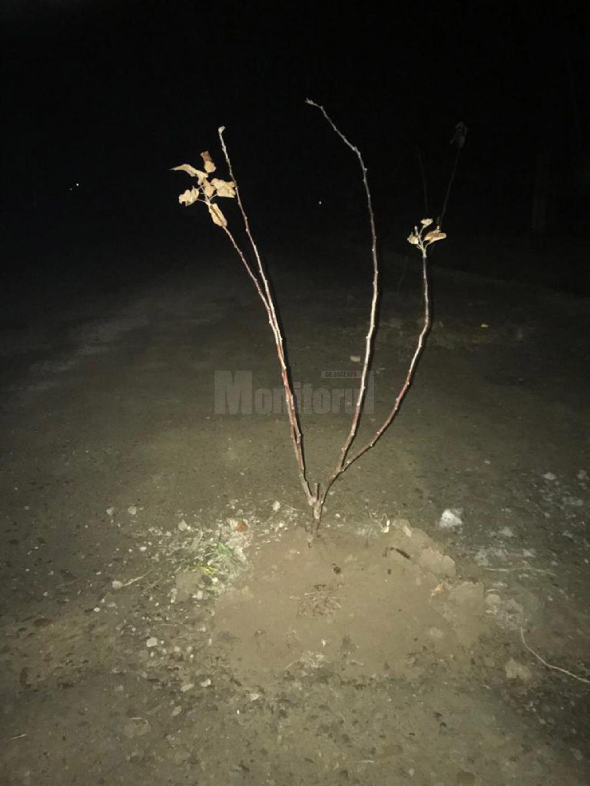 Găurile apărute pe principala arteră rutieră a comunei sucevene Mitocu Dragomirnei – DJ 208 D, chiar în zona sediului administrației locale, au fost acoperite cu pământ, în care au fost apoi „plantate” crengi de arbori.