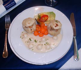 Se servește la farfurie câte două bucăți la porție, împreună cu sosul format și rondele de gulioare, iar deasupra pătrunjel verde tocat mărunt și morcovi sote.