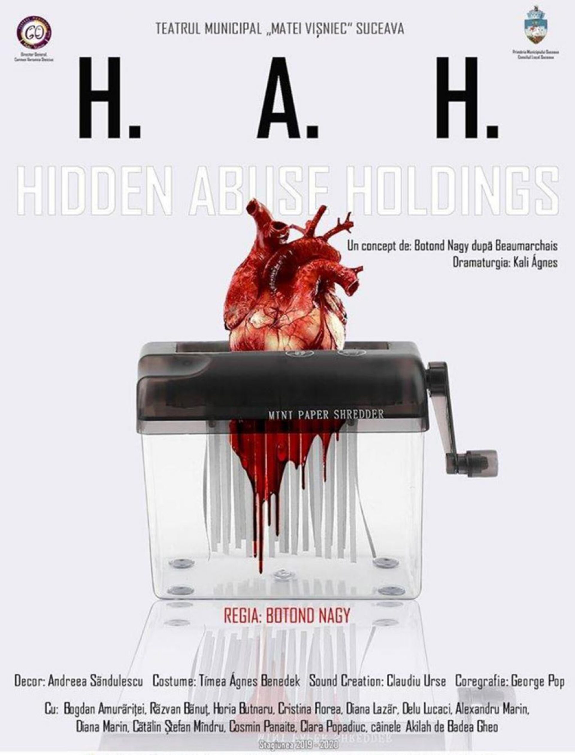 Spectacolul H.A.H.- Hidden Abuse Holdings este un concept de Botond Nagy, după Beaumarchais, ce va fi realizat pe scena teatrului sucevean de o echipă de producție talentată și entuziastă. Regizorul Botond Nagy a ales să lucreze pentru acest proiect cu artiști puternici și creativi, apreciați de critica de specialitate, dar și de public: Kali Ágnes – dramaturg și poet, Andreea Săndulescu – scenograf,Tímea Ágnes Benedek -costume designer, Claudiu Urse – compozitor și George Pop – coregraf.