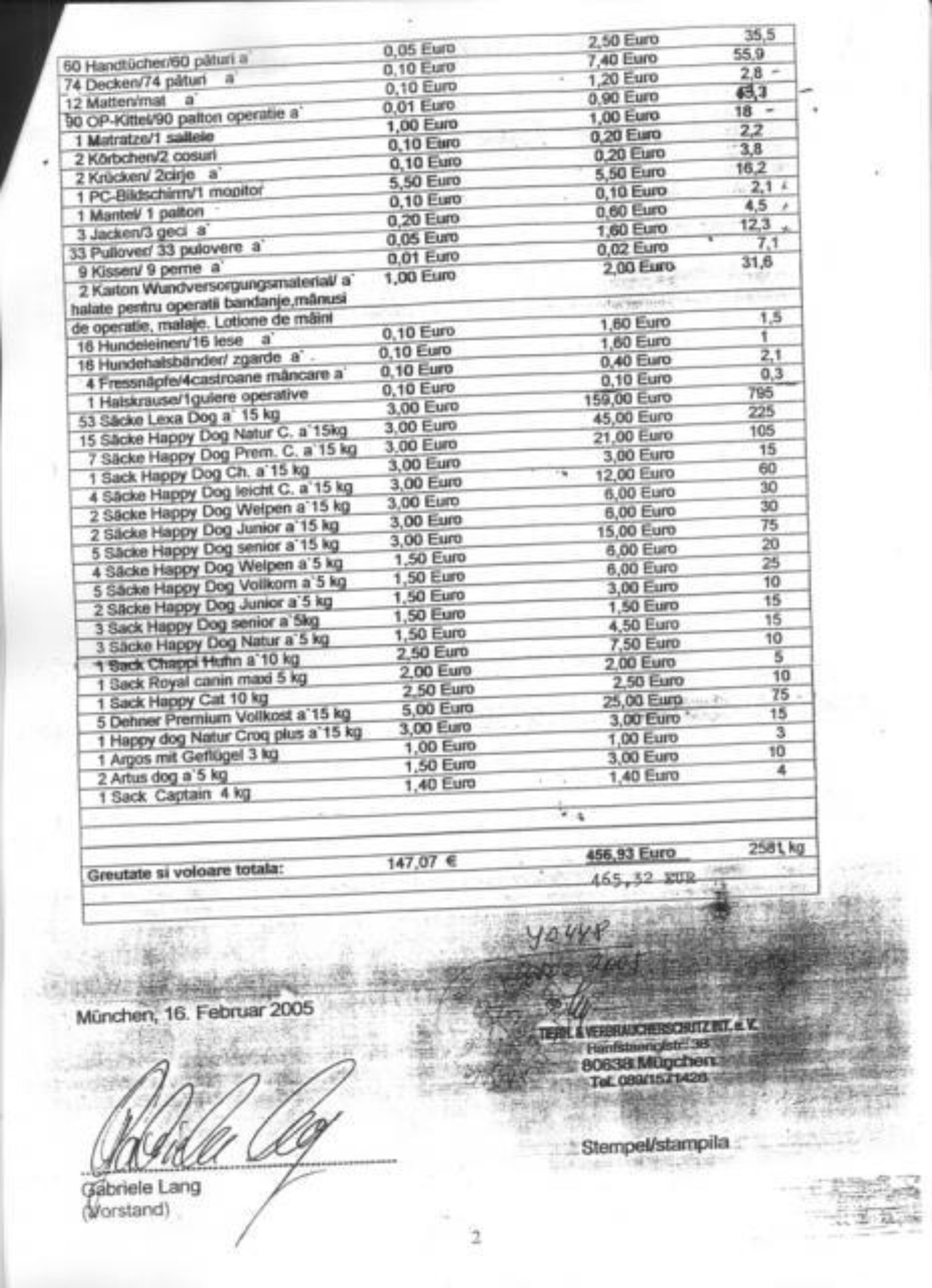 Greutatea totală a transportului a fost de 2,581 tone și, conform donatorului, valoarea era de 465,32 euro. Din documentele transmise de donatorul german nu reiese de nicăieri că îmbrăcămintea ar fi pentru câini, așa cum încearcă să convingă lista redactată de Asociația Bruno Pet pentru a justifica importul.