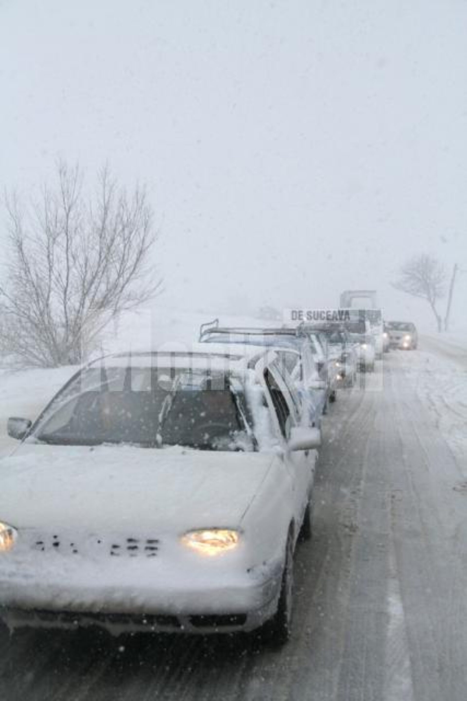 „Nu este nici un blocaj, se circulă mai greu din cauza zăpezii căzute pe carosabil”, a fost anunțul lui Andrei Huțanu, deși sute de șoferi și pozele surprinse de fotoreporterul ziarului Monitorul de Suceava spun cu totul altceva.