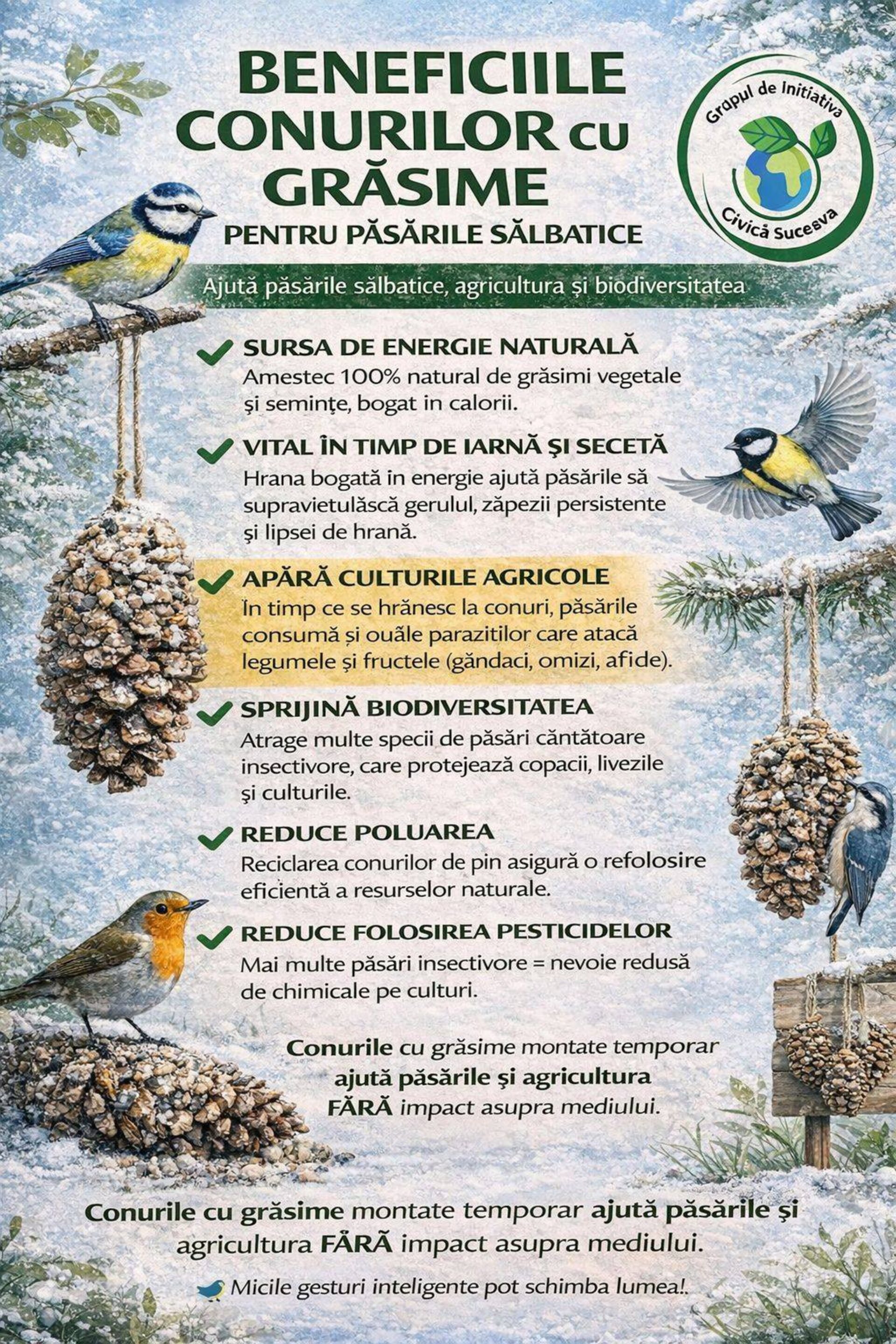 ”Prima noastră acțiune, pentru micile forme de viață din natură. În sezonul rece, aceste puncte de hrană pot face diferența dintre supraviețuire și epuizare pentru multe păsări sălbatice. În frig, în ceață, în pădurea care pare adormită, am ales să fim parte din echilibrul ei, nu doar spectatori. Pentru că natura nu înseamnă doar peisaj, înseamnă și responsabilitate. Fiecare hrănitoare agățată într-un copac e, de fapt, o șansă în plus pentru o pasăre să treacă peste iarnă.
