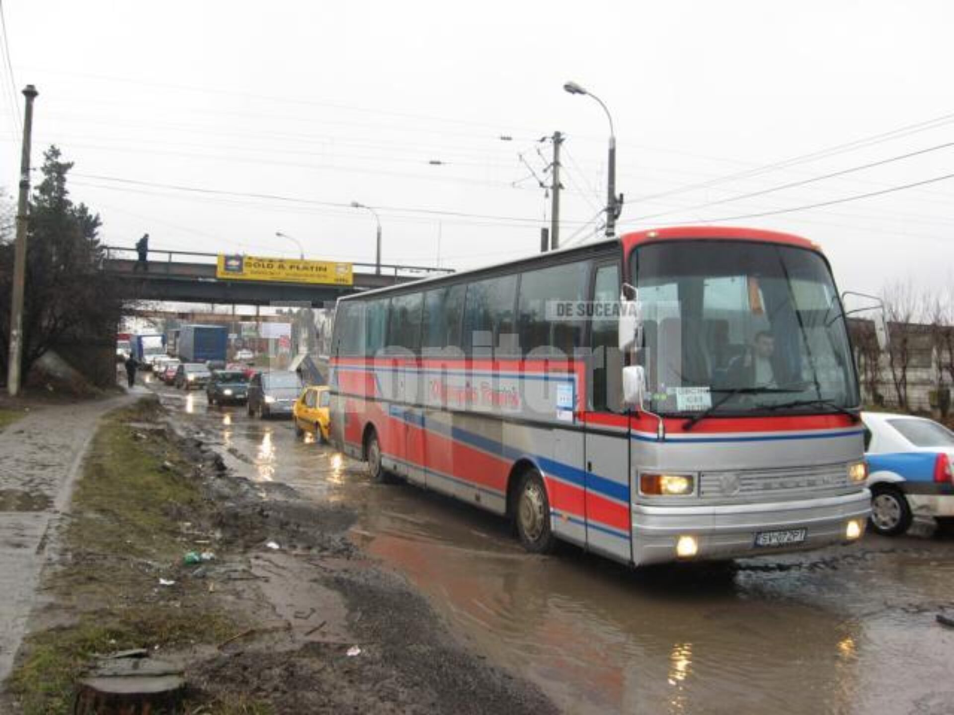 Pe fondul ploilor căzute în ultimele două zile, porțiunea de drum din zona pasarelei poate fi traversată doar cu viteza melcului. Cum imensele cratere s-au umplut cu apă, șoferii sunt în imposibilitatea de a mai evita măcar parțial zonele transformate în adevărate șanțuri, numai bune de rupt mașina în ele.
