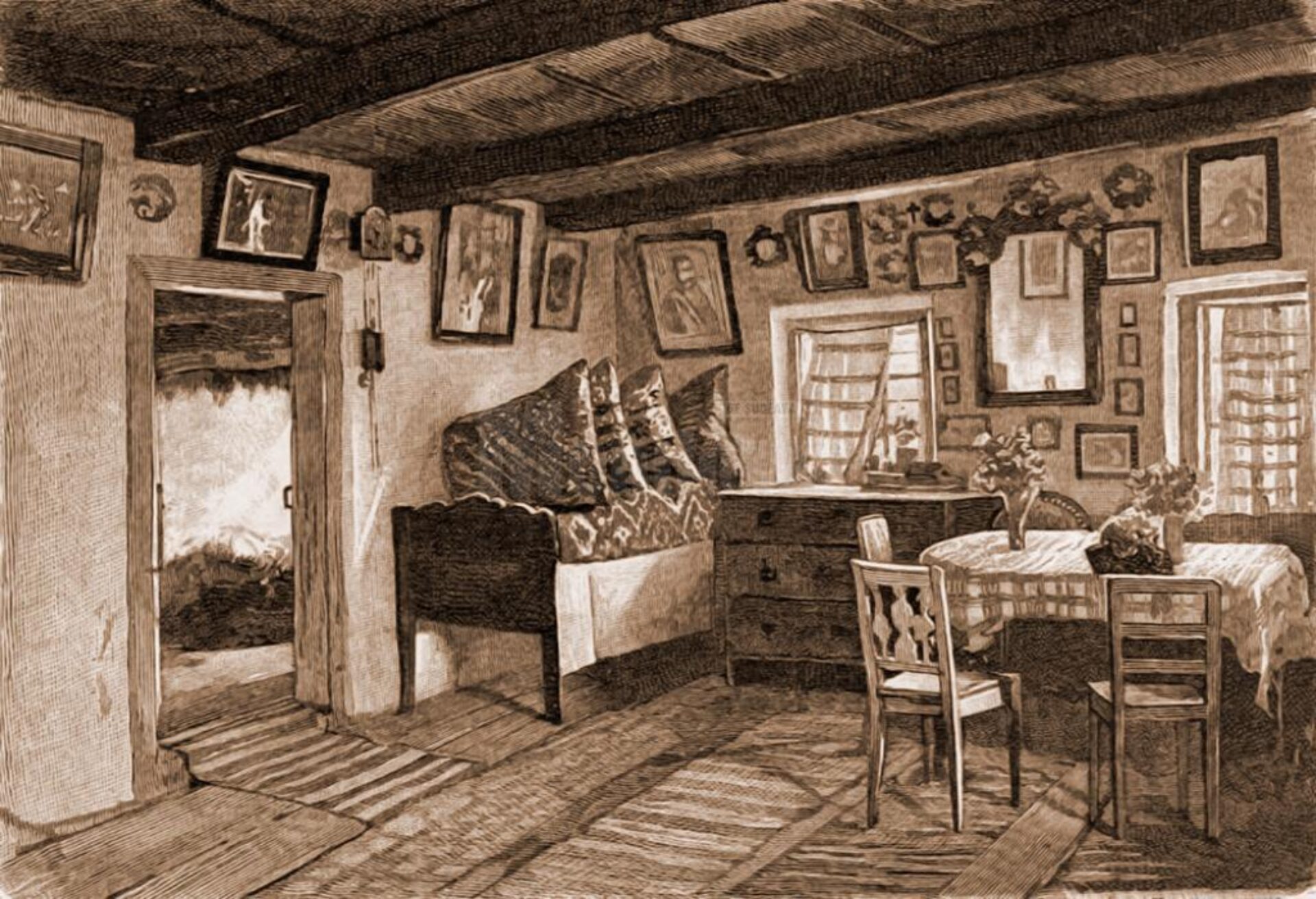 Interior de casă ungurească din Dornești – desen de Mattias Adolf Charlemont (1820-1871)