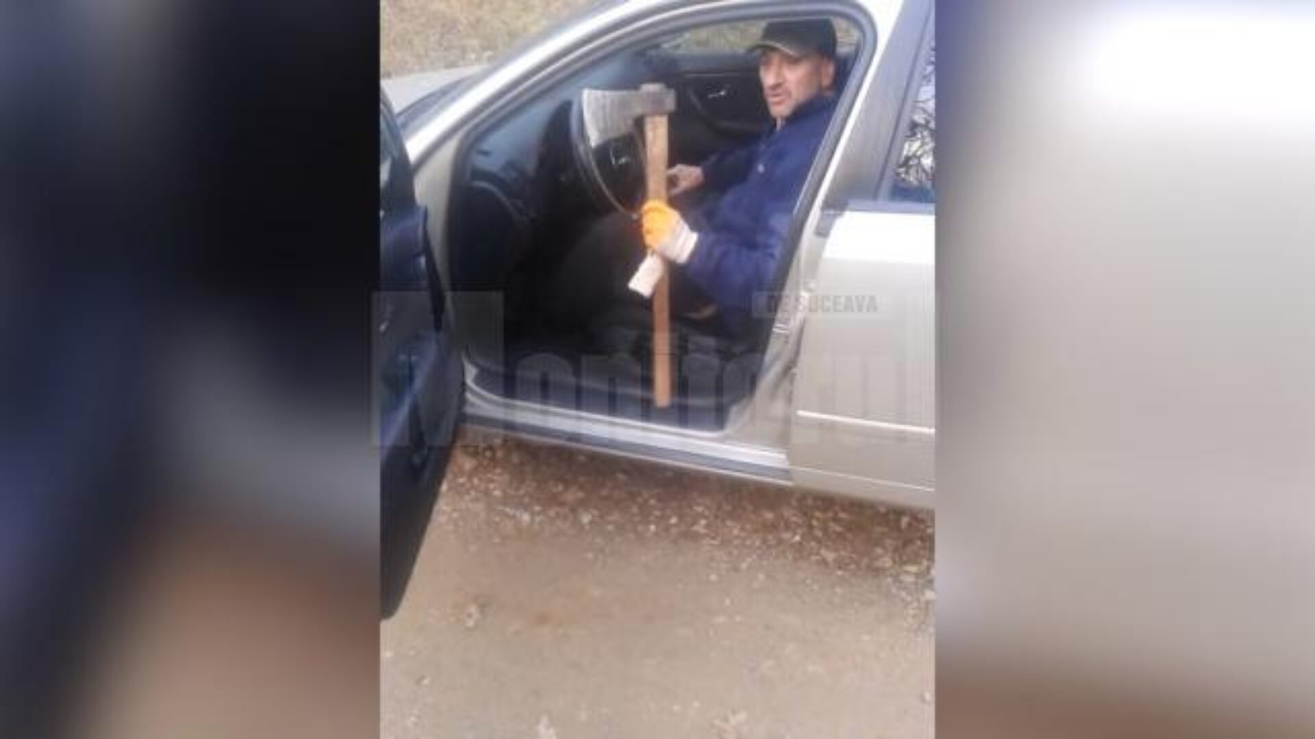 Marinică Aelenei cu toporul în mână în mașina pădurarului