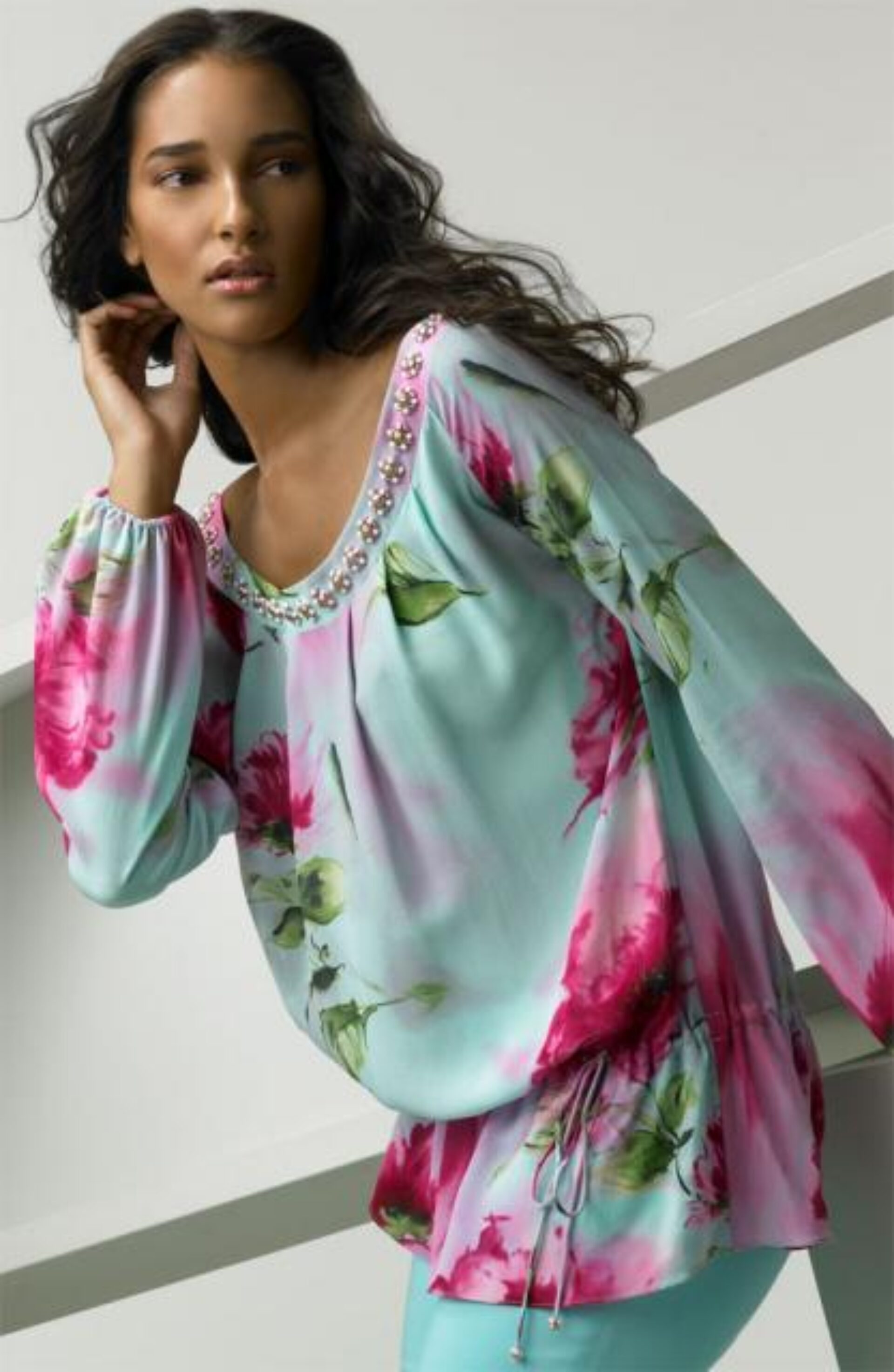 Dacă doriți să îmbrăcați o bluză cu imprimeu floral, o puteți purta cu o tunică din muselină cu volum nedefinit și pantaloni strâmți sau tip șalvar, dintr-un material fluid. Ori puteți opta pentru o fustă lungă cu imprimeu floral și colorat, pe care să o asociați cu un top uni negru sau în culoarea dominantă a imprimeului.