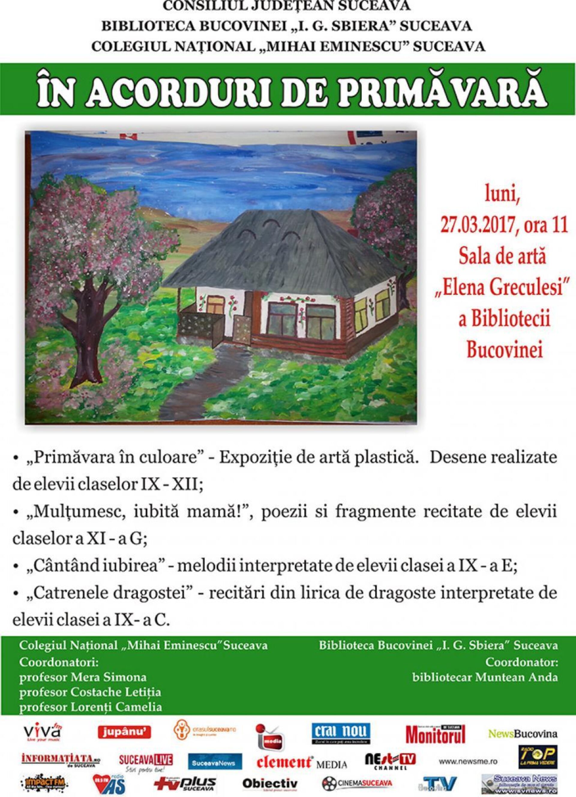 Consiliul Județean Suceava, Biblioteca Bucovinei „I.G. Sbiera” Suceava și Colegiul Național „Mihai Eminescu” Suceava organizează luni, 27 martie, de la ora 11:00, în Sala de artă „Elena Greculesi” a Bibliotecii Bucovinei, acțiunea „În acorduri de primăvară”. Evenimentul cultural cuprinde o expoziție de artă plastică, „Primăvara în culoare”, desenele fiind realizate de elevii claselor IX-XII, un recital de poezii și fragmente susținut de elevii claselor a XI-a G, intitulat „Mulțumesc, iubită mamă!”, melodii interpretate de elevii clasei a IX-a E, sub genericul „Cântând iubire”, și recitări din lirica de dragoste – „Catrenele dragostei”, în interpretarea elevilor din clasa a IX-a C.
