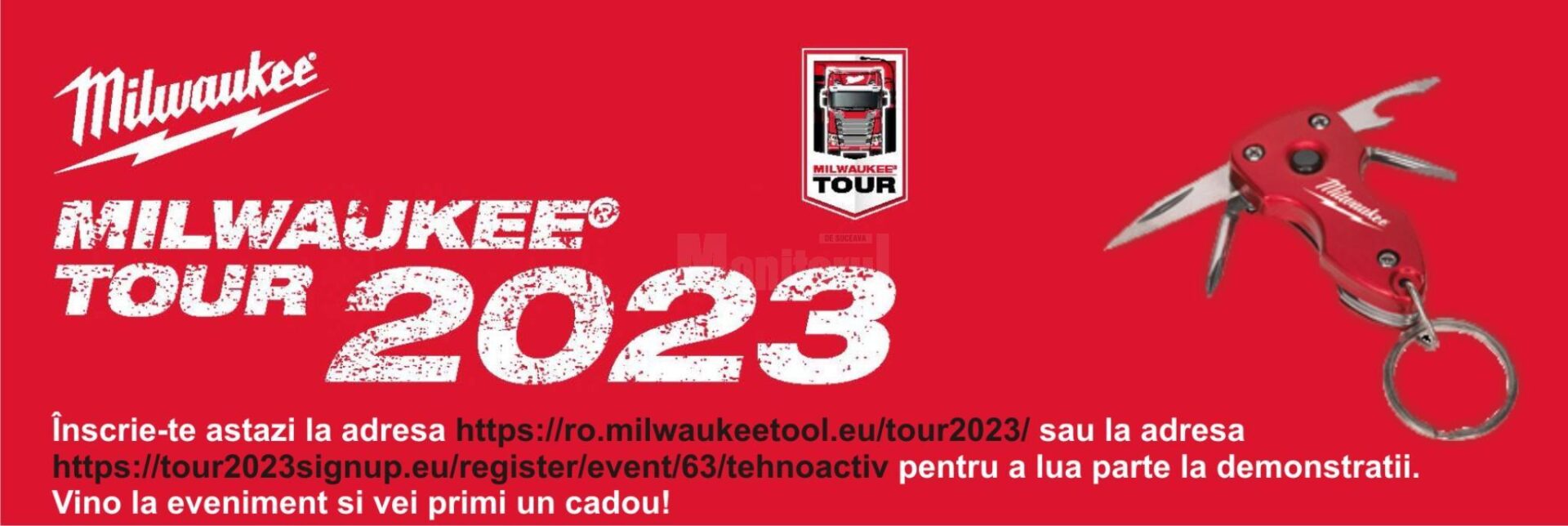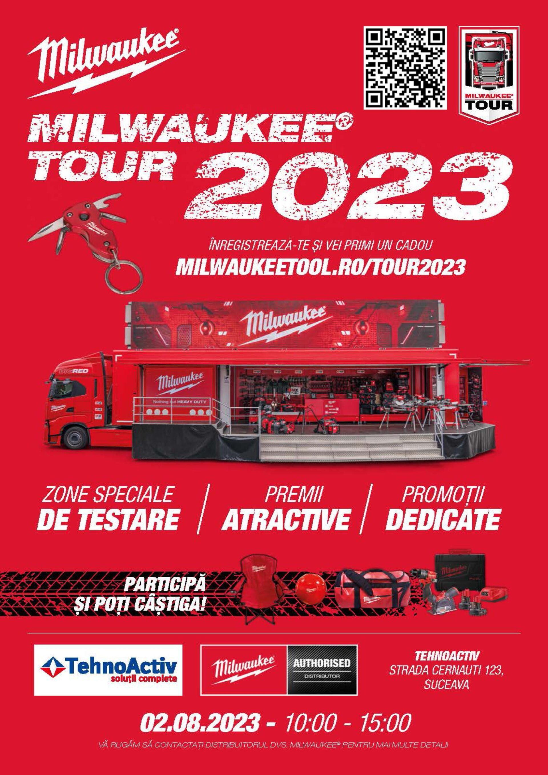 TEHNOACTIV SRL Suceava si MILWAUKEE® Tool, producător american, au placerea de a vă invita în ziua de miercuri, în data de 02.08.2023, începând cu orele 10.00 la sediul din Str. Cernăuți nr. 123, loc. Suceava, jud. Suceava pentru a vedea și testa cele mai noi scule electrice și accesorii MILWAUKEE® și pentru a vă informa (actualiza) referitor la cele mai noi tendințe în domeniu, în cadrul evenimentului MILWAUKEE® TOUR, ediția 2023, eveniment organizat în fiecare an, aflat la a șasea ediție. În cadrul evenimentului se vor prezenta caracteristicile dar și modul de utilizare al sculelor electrice Milwaukee, participanții având posibilitatea de a vedea și de a testa orice echipament MILWAUKEE® aflat în programul demo MILWAUKEE® TOOL. Acest eveniment se adresează în special specialiștilor din industrie, dar oricine dorește să ia contact cu acest brand renumit este binevenit.