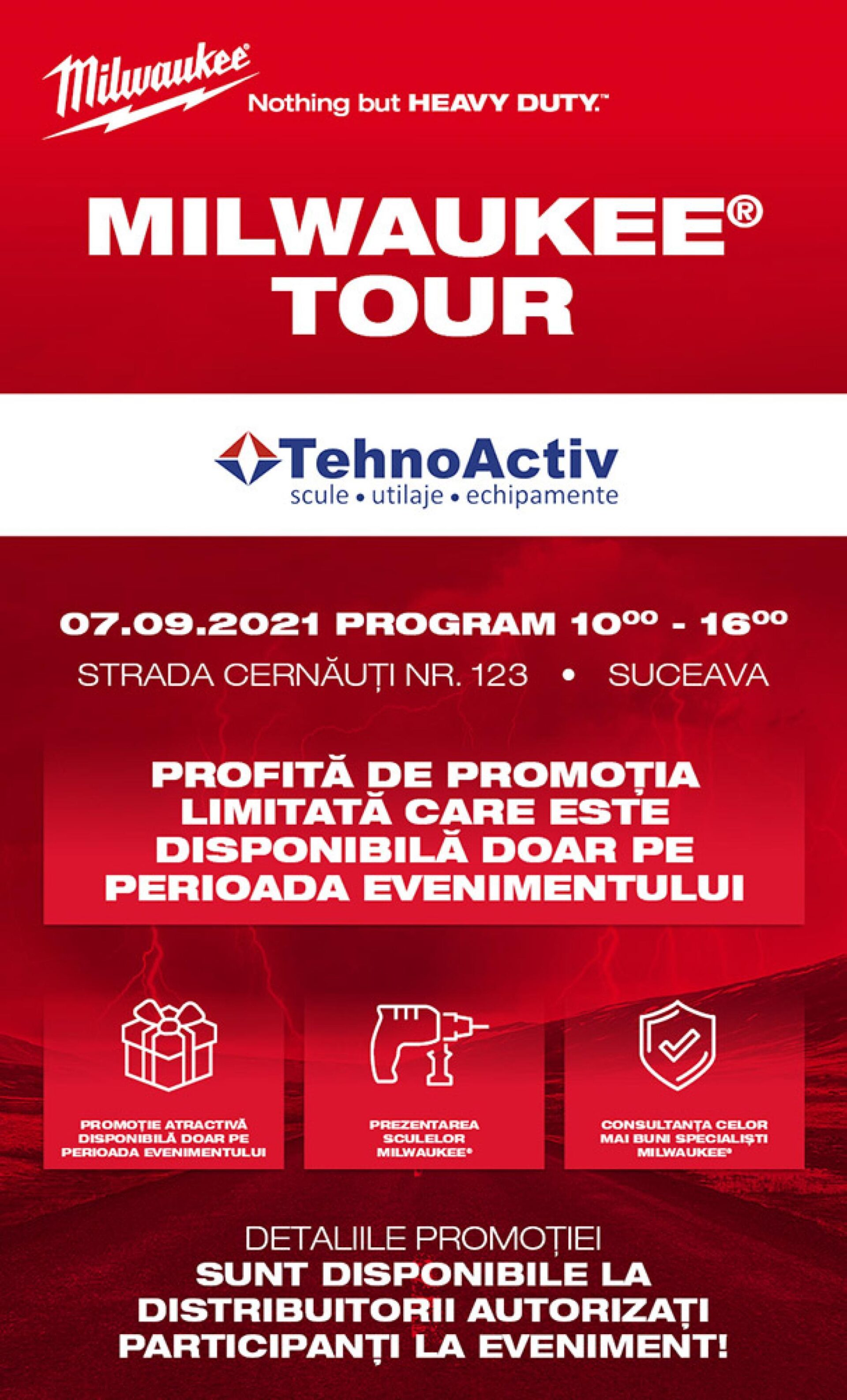 MILWAUKEE TOUR este un eveniment unic în Suceava și constă în prezentarea tuturor echipamentelor Milwaukee Tool, producător american, de către specialiști și demonstratori ai acestei firme. În cadrul evenimentului se vor prezenta caracteristicile dar și modul de utilizare al sculelor electrice Milwaukee, participanții având posibilitatea de a vedea și de a testa orice echipament Milwaukee aflat în programul demo MILWAUKEE TOOL. Acest eveniment se adresează în special specialiștilor din industrie, dar, oricine dorește să ia contact cu acest brand este binevenit.