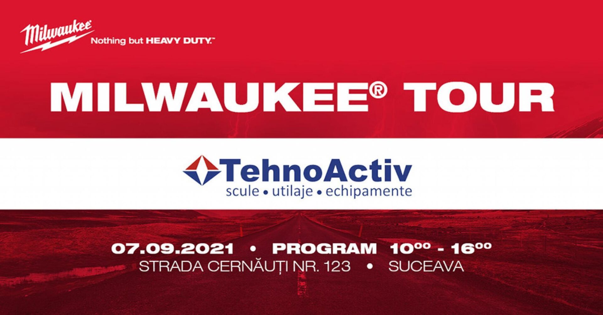 Acțiunea Milwaukee TOUR, ediția septembrie 2021, se va desfășura marți, 07.09.2021, în parcarea din fața sediului firmei TEHNOACTIV S.R.L. din str. Cernăuți nr. 123, loc. Suceava, jud. Suceava (lângă fabrica de înghețată Betty Ice) între orele 10.00 – 16.00. Intrarea la acest eveniment este liberă. TEHNOACTIV S.R.L. Suceava așteaptă toate persoanele fizice și juridice interesate la acest eveniment cu diferite surprize și promoții.