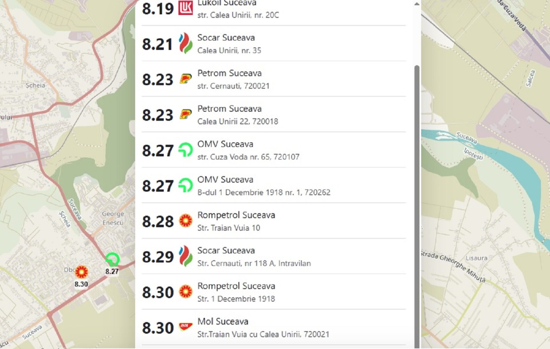 La una dintre stațiile Rompetrol, cea de pe strada 1 Decembrie, motorina standard se comercializa miercuri la prânz cu 8,30 lei/litru, la fel ca și la benzinăria Mol.
