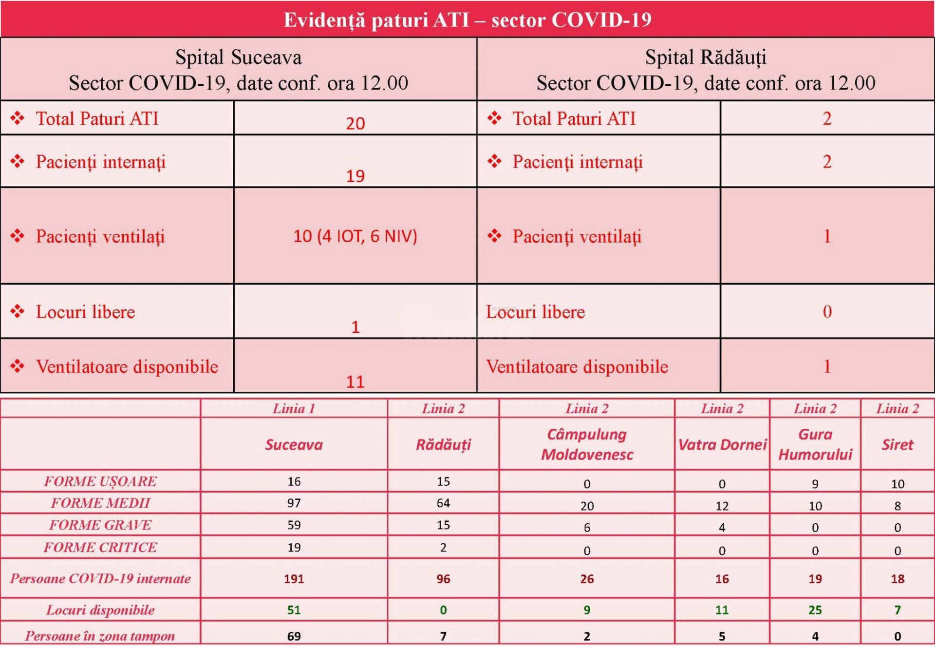 În Spitalul Județean de Urgență „Sfântul Ioan cel Nou” Suceava sunt 538 de pacienți internați, iar numărul celor cu Covid se apropie de 200, respectiv 191 de pacienți diagnosticați cu Covid-19. Dintre aceștia, 59 prezintă forme severe și 19 au forme grave, fiind internați în secția ATI. Șase pacienți din ATI sunt ventilați neinvaziv și 4 sunt ventilați invaziv.