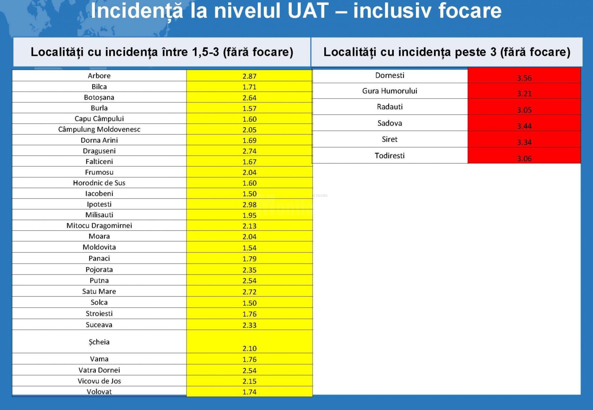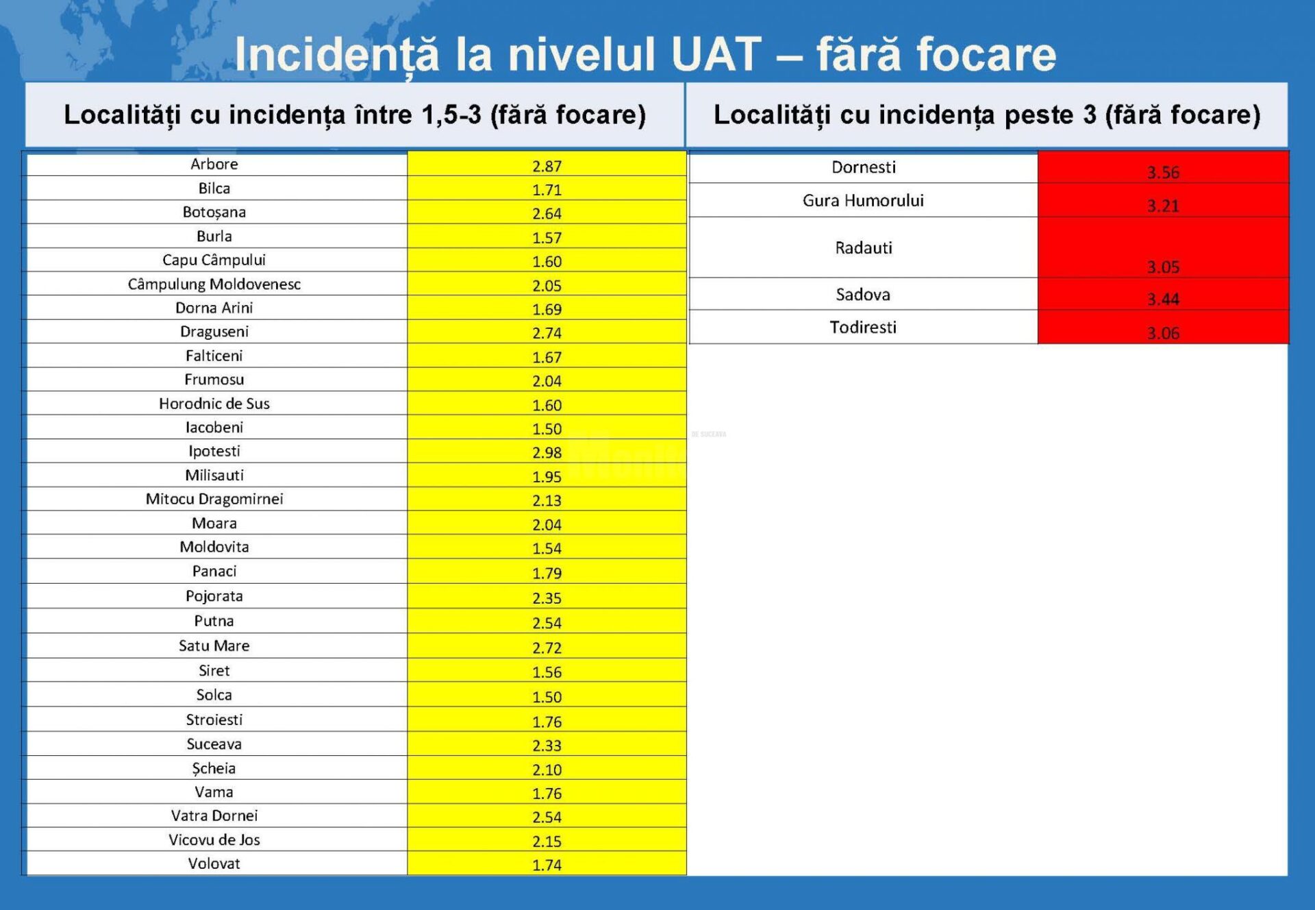 În carantină sunt 968 persoane, din care 52 intrate în ultimele 24 de ore și în izolare la domiciliu se află 665 de persoane, din care 39 intrate în ultimele 24 de ore. Conform distribuției cazurilor Covid-19 pe unități administrativ-teritoriale, din cele 114 localități, 9 nu au niciun caz de infecție Covid-19 în evoluție, 14 au câte un caz în evoluție, 39 au sub cinci cazuri în evoluție, 30 au sub zece cazuri în evoluție, iar 22 au peste zece cazuri în evoluție. 79 de localități sunt în zona verde, 29 în zona galbenă și 6 – Dornești, Gura Humorului, Rădăuți, Sadova, Siret și Todirești sunt în zona roșie, cu incidență de peste 3 la mie. La Siret este în evoluție un bocar de boală, la Centrul de Asistență Socială Ingvar Kamprad, unde sunt 17 cazuri de Covid-19.