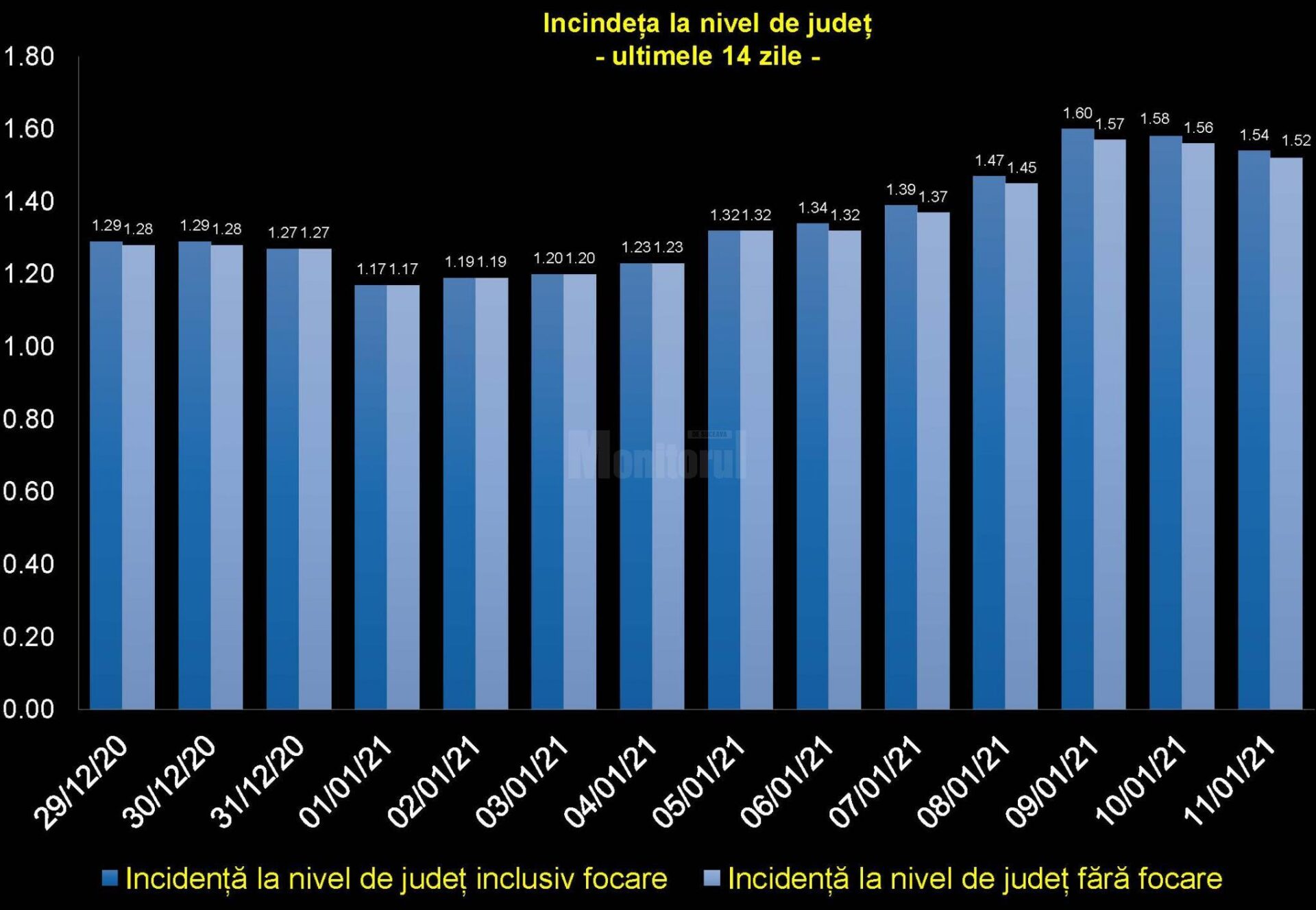 La această dată, incidența cazurilor pozitive la nivelul județului s-a redus, de la 1,60 la mie pe 1 ianuarie, la 1,52 la mie pe 11 ianuarie. În municipiul Suceava incidența este de 2,33 la mie, mai scăzută față de ziua precedentă, dar mai mare față de 5 ianuarie, când a fost 2,09 la mie. Numărul cazurilor active în orașul reședință de județ este de 299.