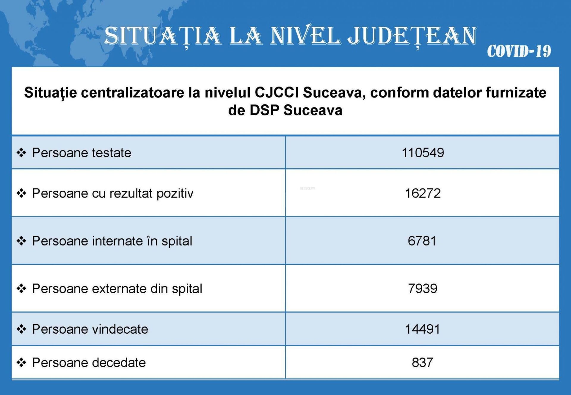 La data de 11 ianuarie, în județul Suceava sunt 1.198 de cazuri de infecție Covid -19 în evoluție. Din martie anul trecut, conform datelor centralizate de către Direcția de Sănătate Publică Suceava, la nivelul județului se înregistrează 14.491 de persoane declarate vindecate de Covid-19, din totalul celor 16.645 confirmate până acum pozitiv.