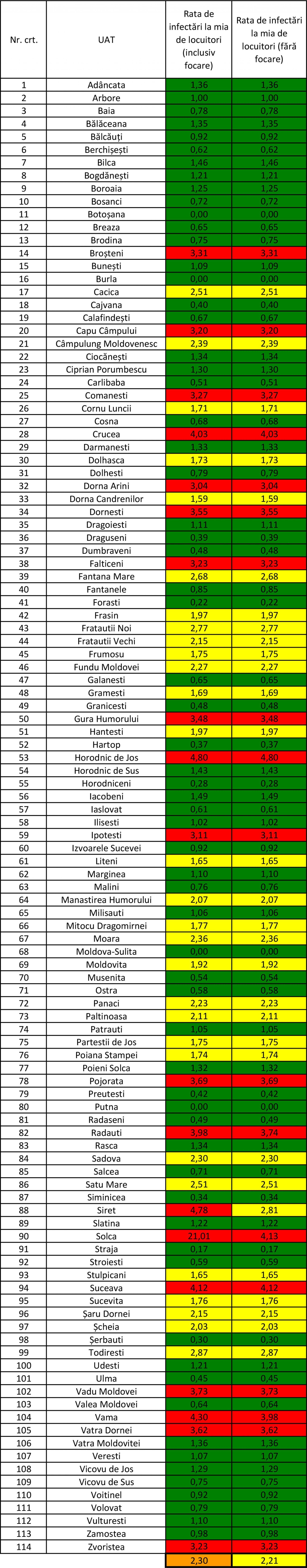 La nivelul județului Suceava, incidența cazurilor de coronavirus este de 2,30 la mia de locuitori, cu tot cu focare, sau 2,21 la mia de locuitori, fără focare.