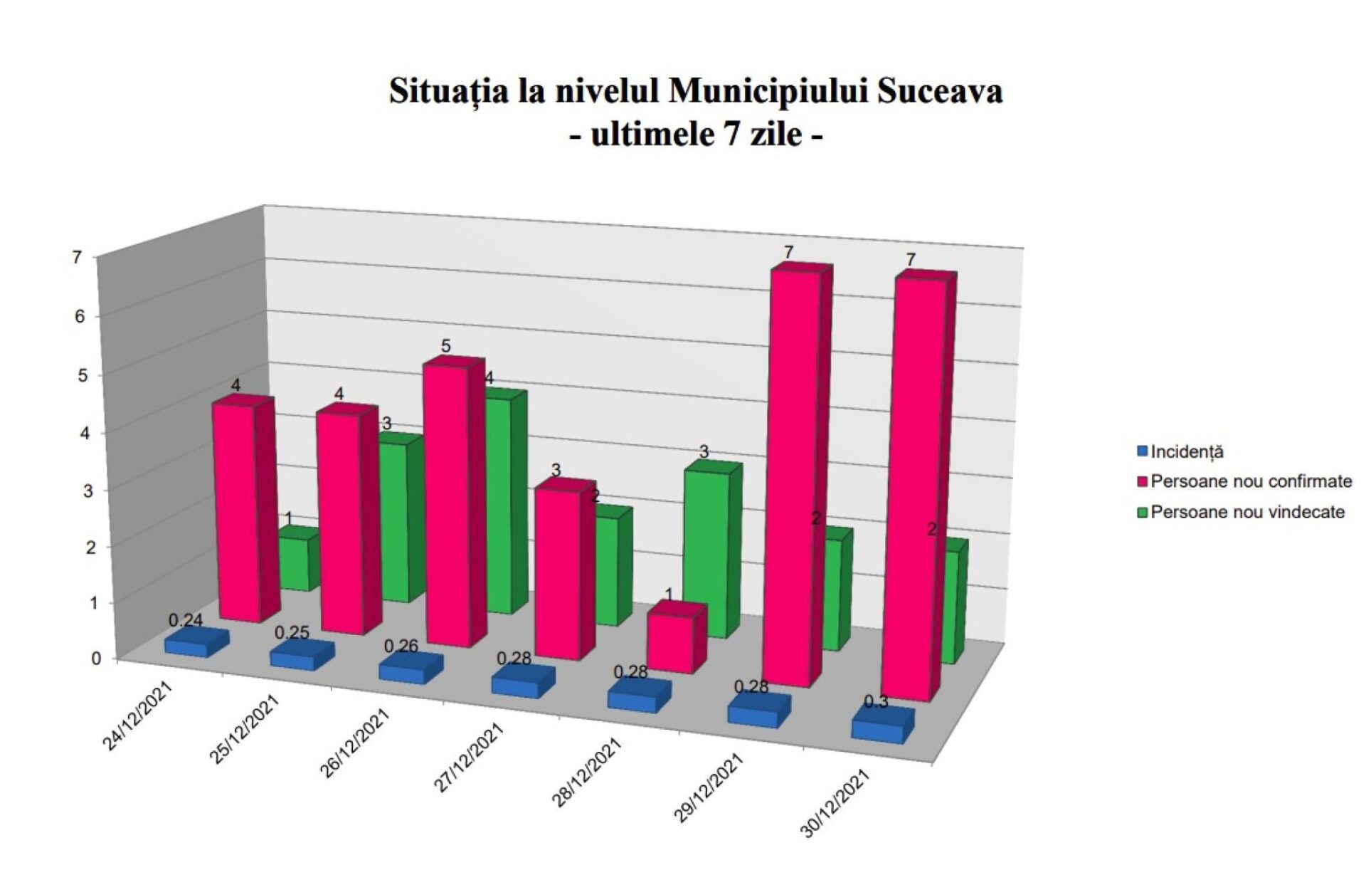 Analiza evoluției situației epidemiologice în municipiul Suceava pe ultimele 7 zile arată creșterea numărului de cazuri noi de infectare cu SARS-CoV-2 și a incidenței, de la 0,24 la mie în Ajunul Crăciunului, la 0,30 la mie în data de 30 decembrie, zi în care numărul cazurilor active a ajuns la 51.
