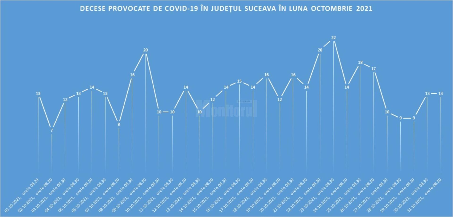 Județul Suceava înregistrează cea mai scăzută incidență din țară a cazurilor de Covid-19, însă numărul de decese rămâne ridicat. Directorul Direcției de Sănătate Publică Suceava, Olivia Vlad, a arătat că în primele două săptămâni ale acestei luni în județul Suceava 156 de oameni au murit din cauza Covid. Alți 418 oameni au murit de Covid în luna octombrie 2021 și 144 au murit în septembrie, în acest val 4 pandemic.