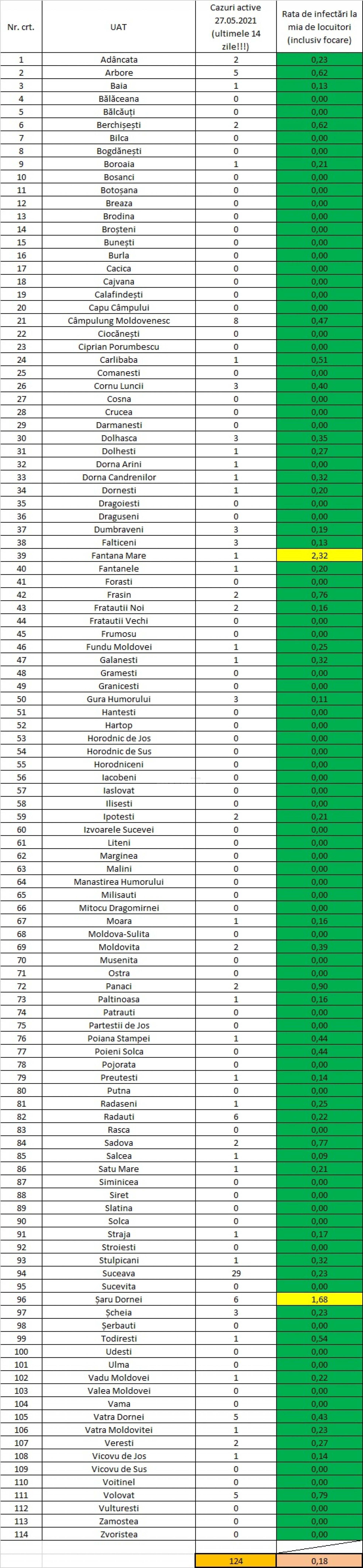 Din cele 114 localități din județ, 68 nu au niciun caz de infecție Covid-19 în evoluție, 24 au câte un caz, 15 au sub cinci cazuri, 6 au sub zece cazuri iar una, municipiul Suceava, are peste zece cazuri în evoluție, respectiv 29 de cazuri. Incidența în municipiul Suceava este de 0,23 la mie. În evoluție sunt în județul Suceava 124 de cazuri.