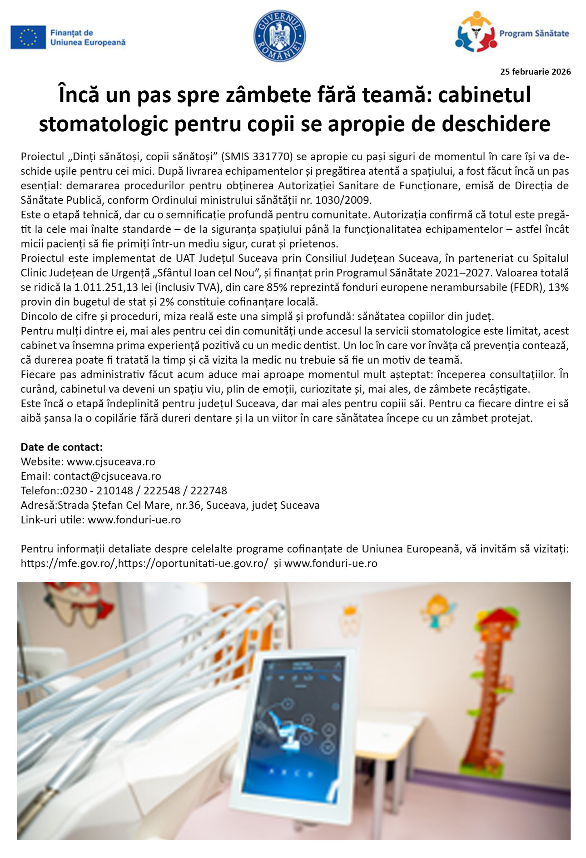 Este încă o etapă îndeplinită pentru județul Suceava, dar mai ales pentru copiii săi. Pentru ca fiecare dintre ei să aibă șansa la o copilărie fără dureri dentare și la un viitor în care sănătatea începe cu un zâmbet protejat.
