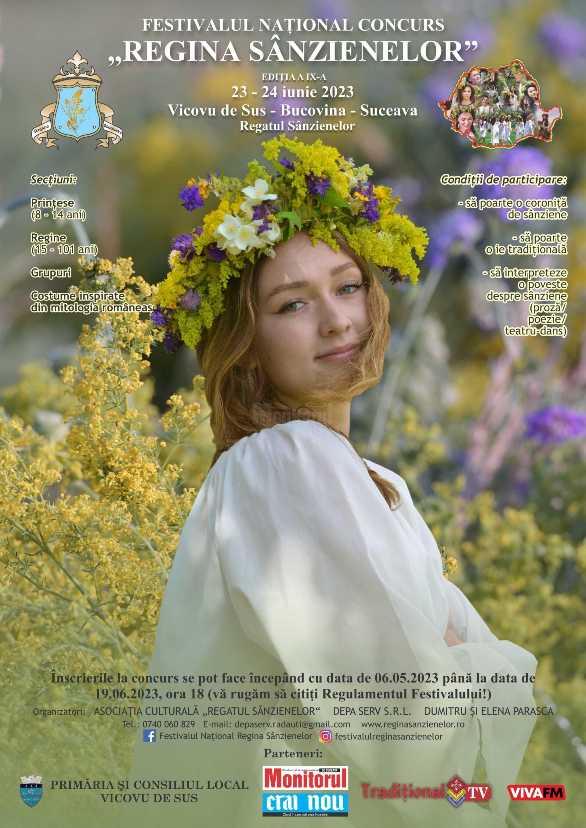Festivalul Național-Concurs „Regina Sânzienelor”, ediția a IX-a, dă startul înscrierilor la cele patru secțiuni ale competiției, sâmbătă, 6 mai 2023, înscrieri care se încheie pe 19 iunie 2023, la ora 18:00. Evenimentul se va desfășura pe 23 și 24 iunie 2023, la Vicovu de Sus, și are ca temă: „Poftiți la masa strămoșilor noștri!”.Condiții de participare: să poarte o coroniță de sânziene; să poarte o ie tradițională, să interpreteze o poveste despre sânziene (proză/poezie/teatru-dans).