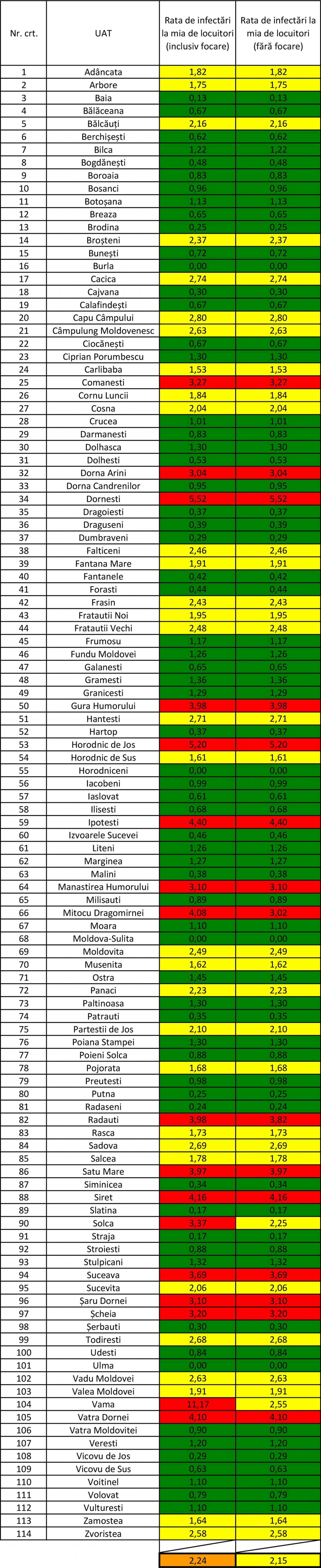 Conform distribuției cazurilor Covid-19 pe unități administrativ-teritoriale, din cele 114 unități administrativ-teritoriale 4 nu au nici un caz de infecție Covid-19 în evoluție – Horodniceni, Moldova Sulița, Burla și Ulma, 15 au câte un caz în evoluție, 31 au sub cinci cazuri în evoluție, 31 au sub zece cazuri în evoluție, iar 33 au peste zece cazuri în evoluție. Cea mai mare incidență a cazurilor pozitive la mia de locuitori – cu focare se înregistrează la Vama, de 11,17 la mie; fără focare, cea mai mare incidență este la Dornești, de 5,52 la mie. Municipiul Suceava are 3,69 la mie.
