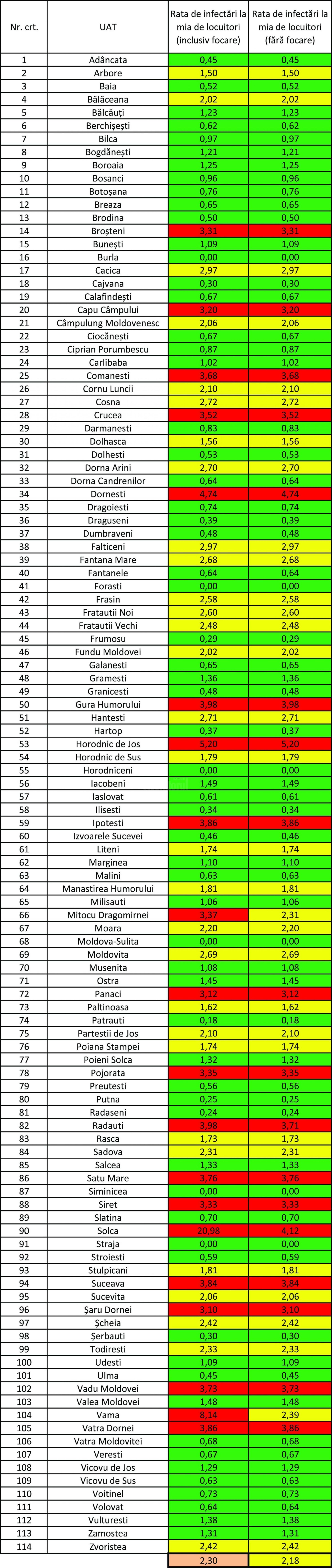 Cea mai mare rată de infectare din județ este în Solca, de 20,98 de cazuri Covid la mia de locuitori, aici fiind luați în calcul și bolnavii din focarul din acest oraș. Fără focarul de Covid, incidența cazurilor din orașul Solca este de 4,12. În Vama, rata de infectare este de 8,14 cu tot cu focarul de Covid de la centrul de bătrâni din această comună, însă scade la 2,39 dacă nu se iau în calcul bolnavii din această locație. Printre cele mai mari rate de infectare cu noul coronavirus din județ se înregistrează în localitățile Horodnic de Jos – 5,20, Dornești – 4,74, Gura Humorului – 3,98, Vatra Dornei și Ipotești – 3,86, Satu Mare – 3,76, Vadu Moldovei – 3,73, Rădăuți 3,71 (fără focare) și 3,98 (cu tot cu bolnavii din focare) și Comănești – 3,68.