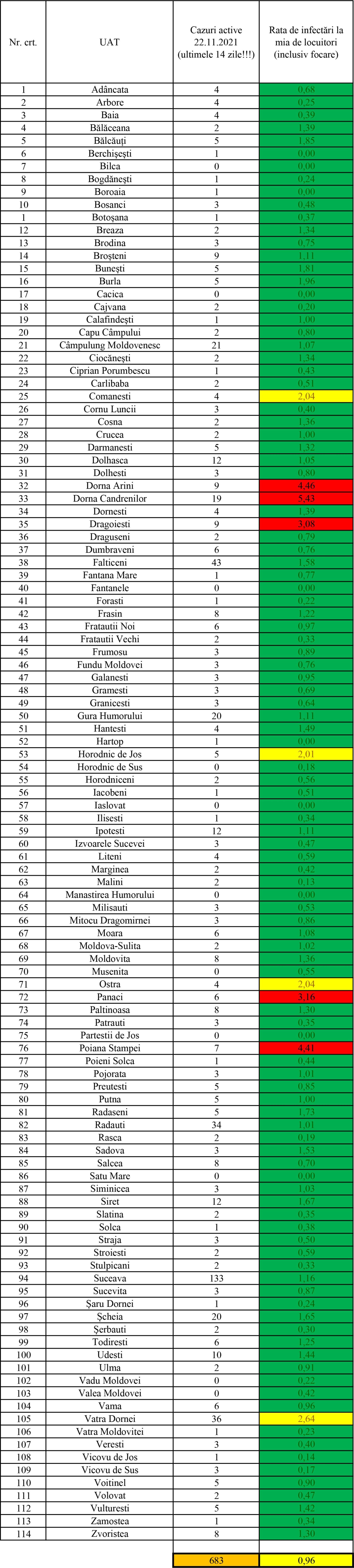În spitalele din județul Suceava, în intervalul 21-22 noiembrie au fost internate 5 persoane cu Covid și a fost externată o persoană. În aceeași perioadă de referință au decedat 7 persoane ca urmare a infecției Covid-19. În spitale erau internați, luni dimineață, 208 pacienți cu Covid: 74 în Spitalul Județean de Urgență „Sf. Ioan cel Nou” Suceava, 47 la Rădăuți, 15 la Câmpulung Moldovenesc, 12 la Gura Humorului, 3 la Siret, 28 la Vatra Dornei și 29 la Fălticeni. Dintre aceștia, cu forme severe și grave de Covid sunt 49 de pacienți la Suceava (15 sunt la ATI, din care 6 pacienți ventilați non-invaziv și 2 pacienți intubați, ventilați invaziv); 12 la Rădăuți (8 la ATI), 8 la Câmpulung Moldovenesc; 7 la Vatra Dornei și 10 la Fălticeni (4 la ATI).