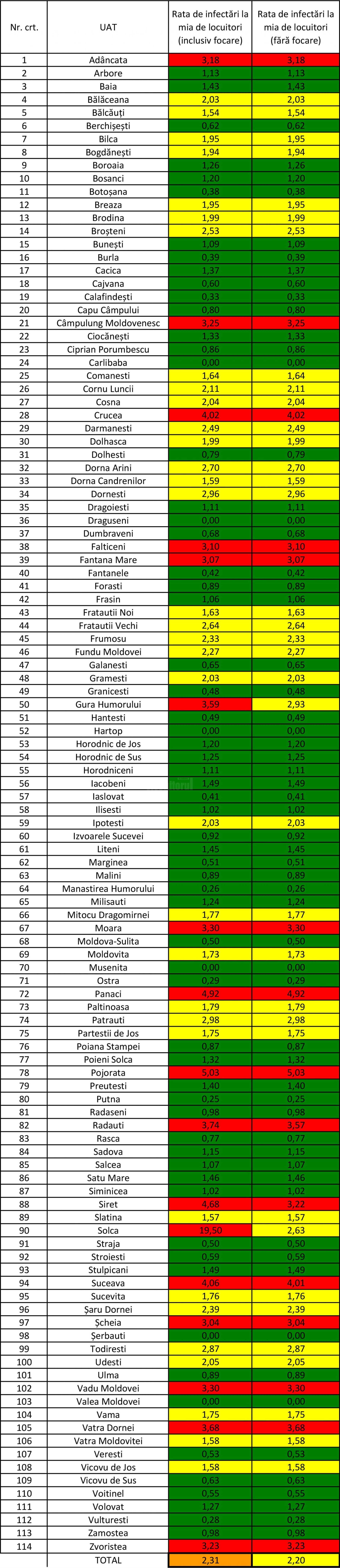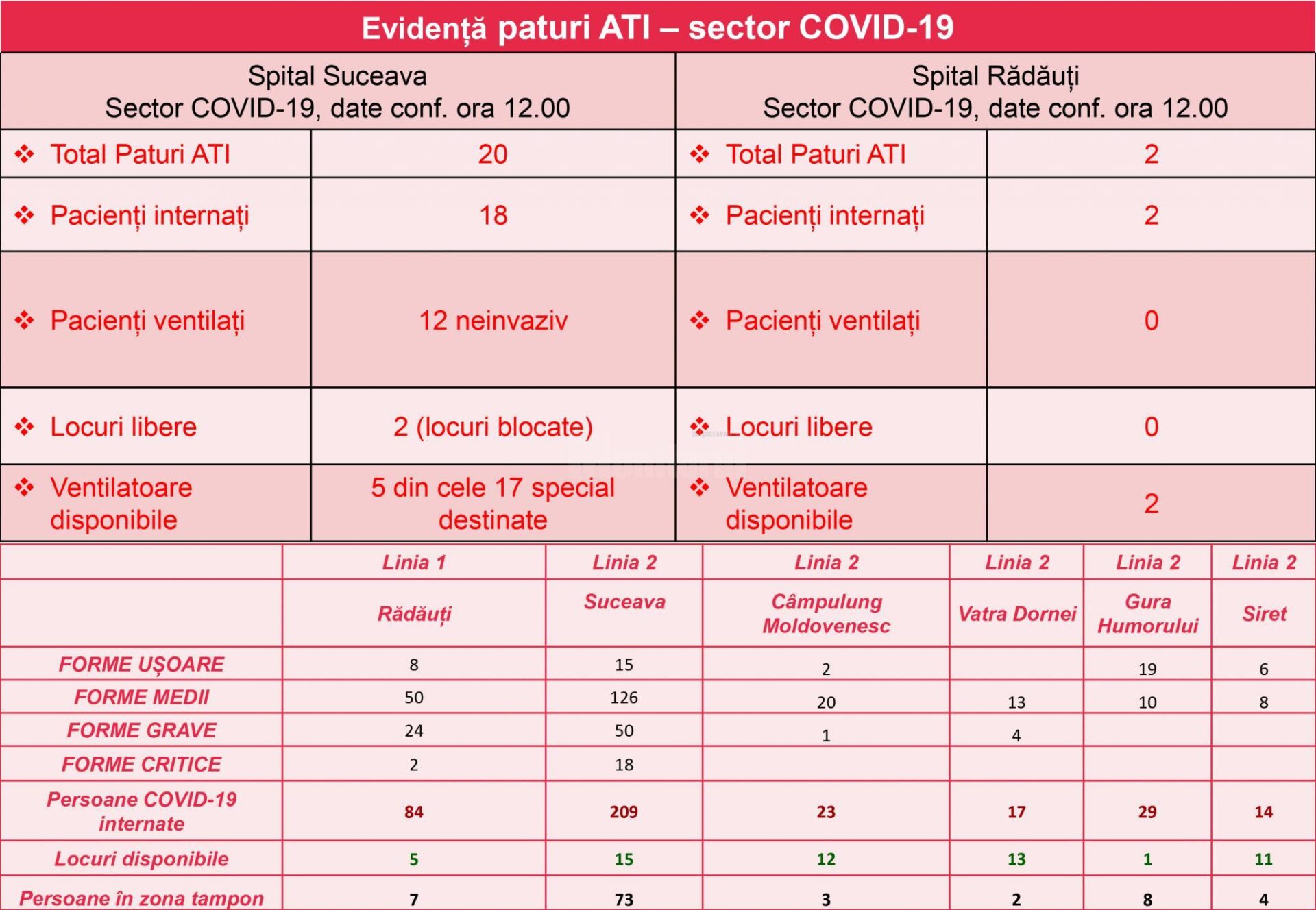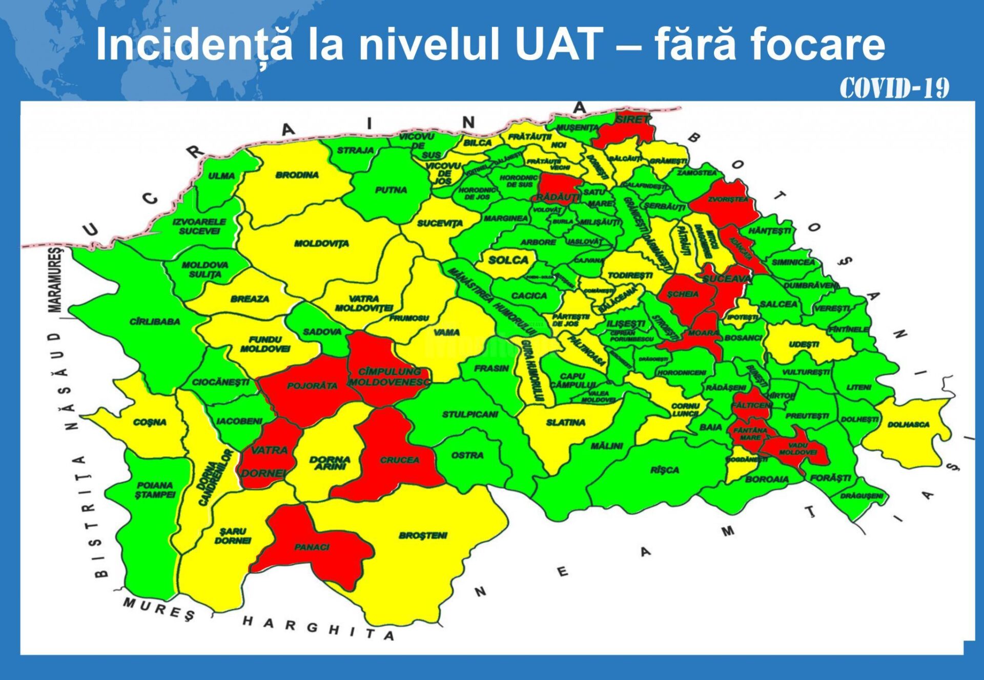 În județ sunt la această dată 5 focare: Centrul regional de proceduri și cazare pentru solicitanți de azil Rădăuți- 6 persoane; Primăria Rădăuți -7, firma Egger – 17, Căminul pentru persoane vârstânice Solca- 45, Spitalul de psihiatrie cronici Siret- 14, Spitalul Județean de Urgență „Sfântul Ioan cel Nou” Suceava – 6, Centrul de servicii multifuncționale pentru copilul aflat în dificultate Gura Humorului-Casa de tip familial „Orhideea” – 12, acesta din urmă declarat miercuri.