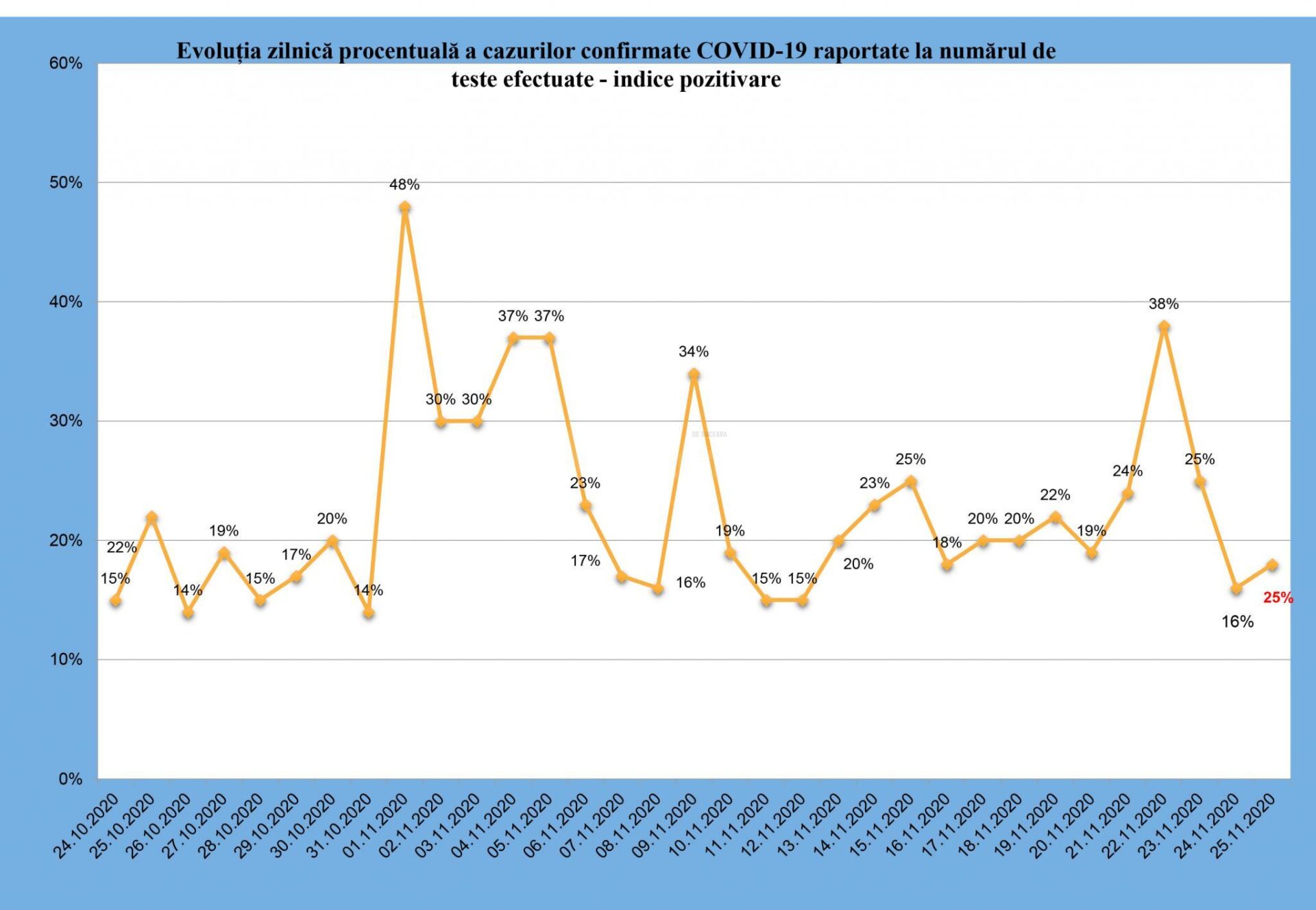 La nivelul județului, incidența cu focare este de 2,31 la mie, iar fără focare de 2,2 la mie. În ceea ce privește indicele de pozitivare, respectiv câte persoane au avut rezultat pozitiv dintre cele testate, graficul întocmit de Comitetul Județean de Coordonare și Conducere a Intervenției, pe baza datelor furnizate de DSP, arată că din 24 octombrie până pe 25 noiembrie proporția a ajuns de la 22% la 25%, cu vârfuri de 48% pe 31 octombrie, de 37% pe 3-4 noiembrie, 34% pe 9 noiembrie și 38% pe 22 noiembrie. Cel mai scăzut, de 14%, a fost pe 26 octombrie și 30 octombrie.