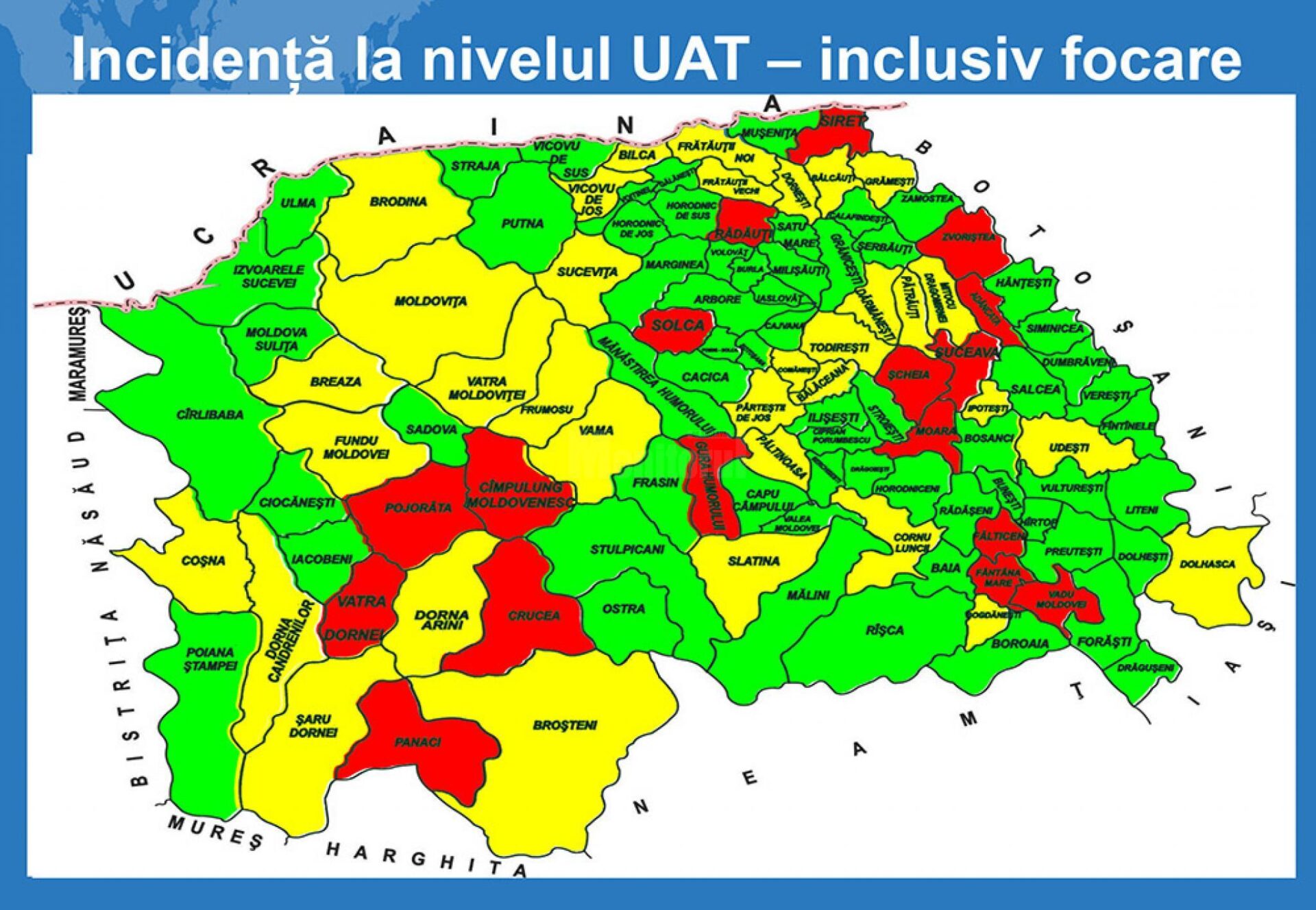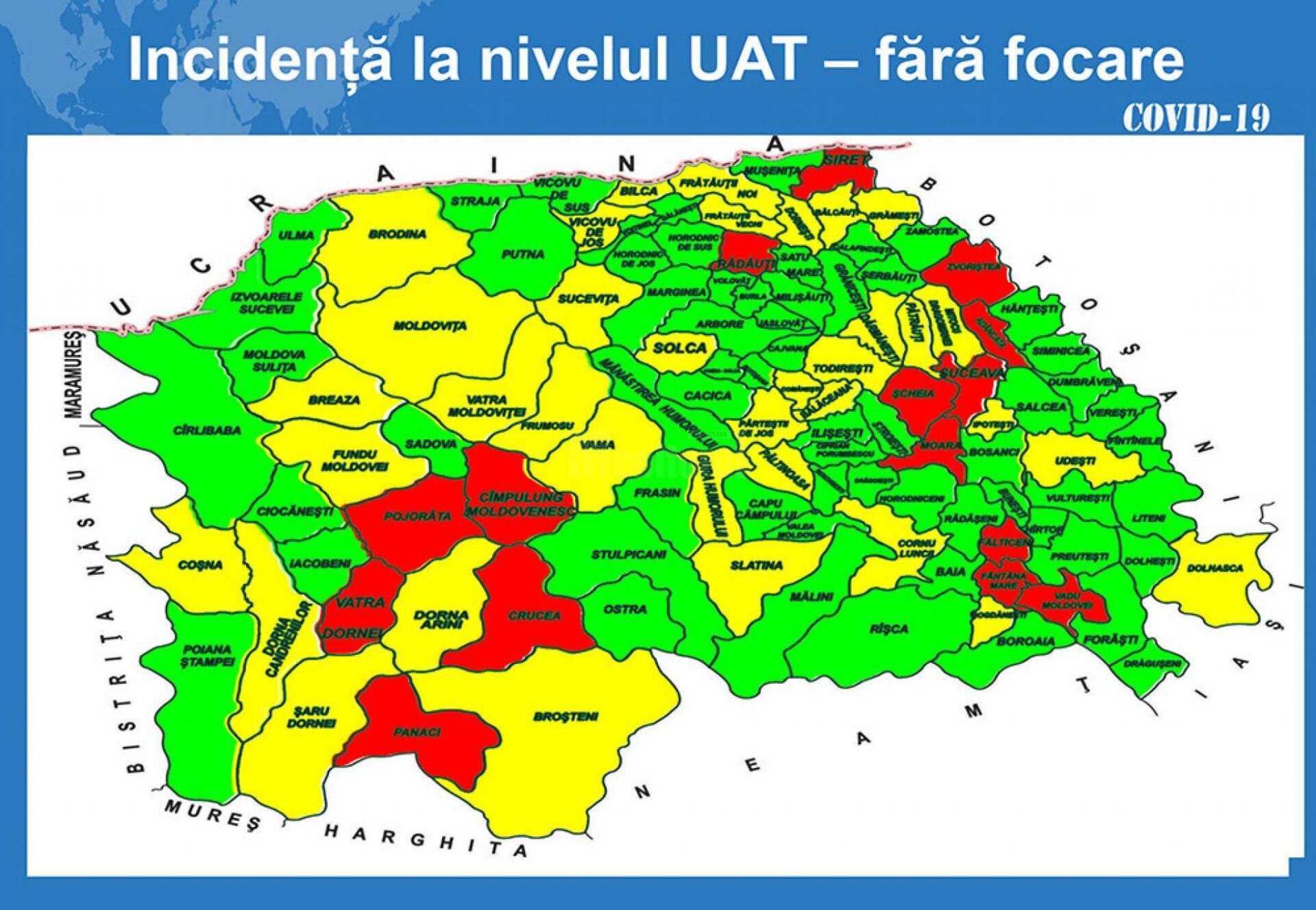 În județ sunt la această dată 5 focare: Centrul regional de proceduri și cazare pentru solicitanți de azil Rădăuți- 6 persoane; Primăria Rădăuți -7, firma Egger – 17, Căminul pentru persoane vrâstnice Solca- 45, Spitalul de psihiatrie cronici Siret- 14, Spitalul Județean de Urgență „Sfântul Ioan cel Nou” Suceava – 6, Centrul de servicii multifuncționale pentru copilul aflat în dificultate Gura Humorului-Casa de tip familial „Orhideea” – 12, acesta din urmă declarat miercuri.