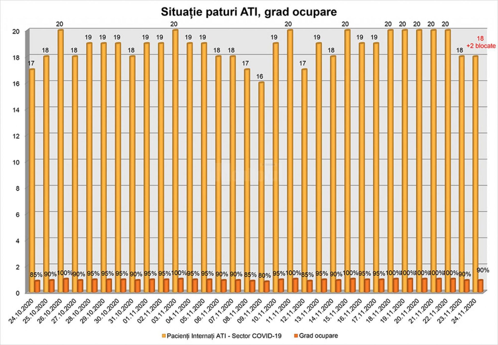 Din punct de vedere al gradului de ocupare a paturilor din Terapie Intensivă, analiza arată că din 24 octombrie până în 24 noiembrie în marea majoritate a zilelor secția ATI a fost ocupată la maximum, 19- 20 de paturi.